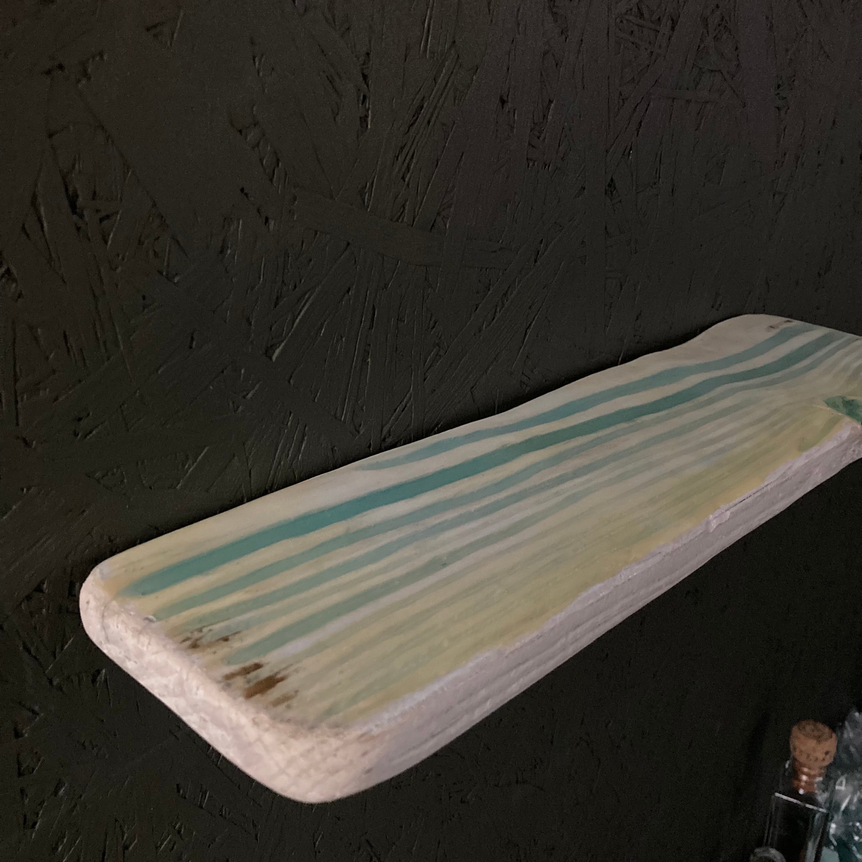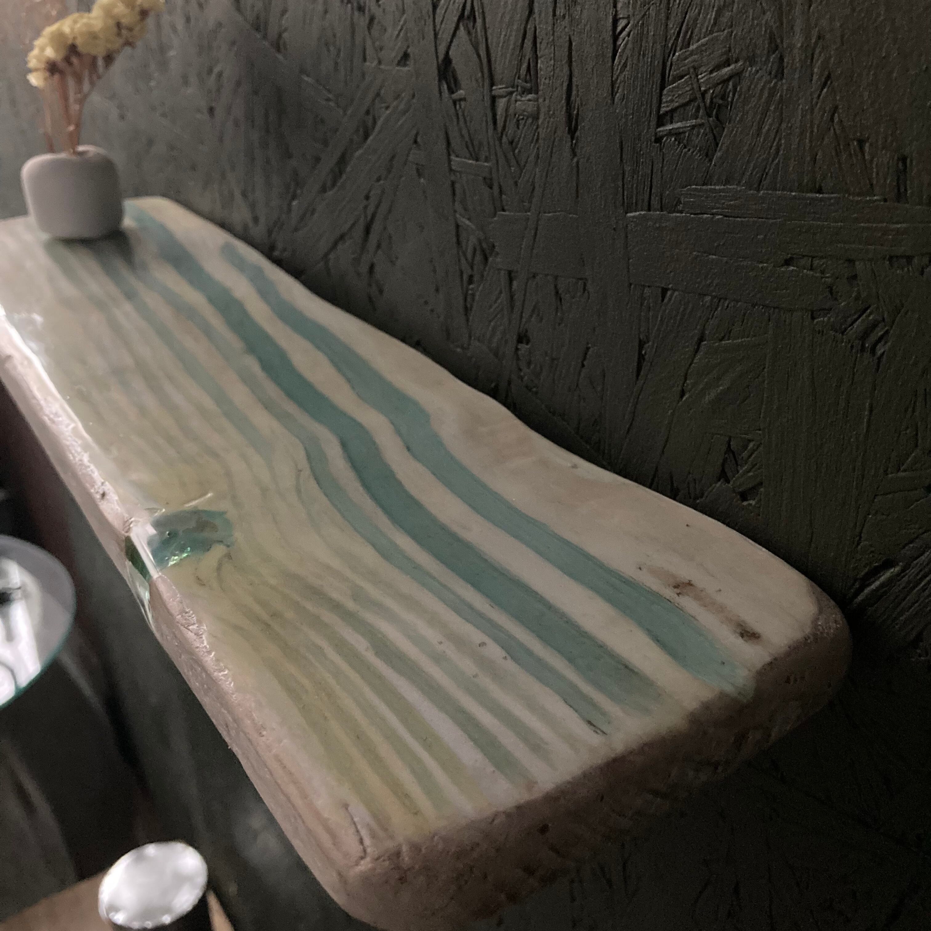 流木(流板)の表面に浮き出た畝にブルーのレジンを流し込み、磨き上げ、棚板を作ってみました。