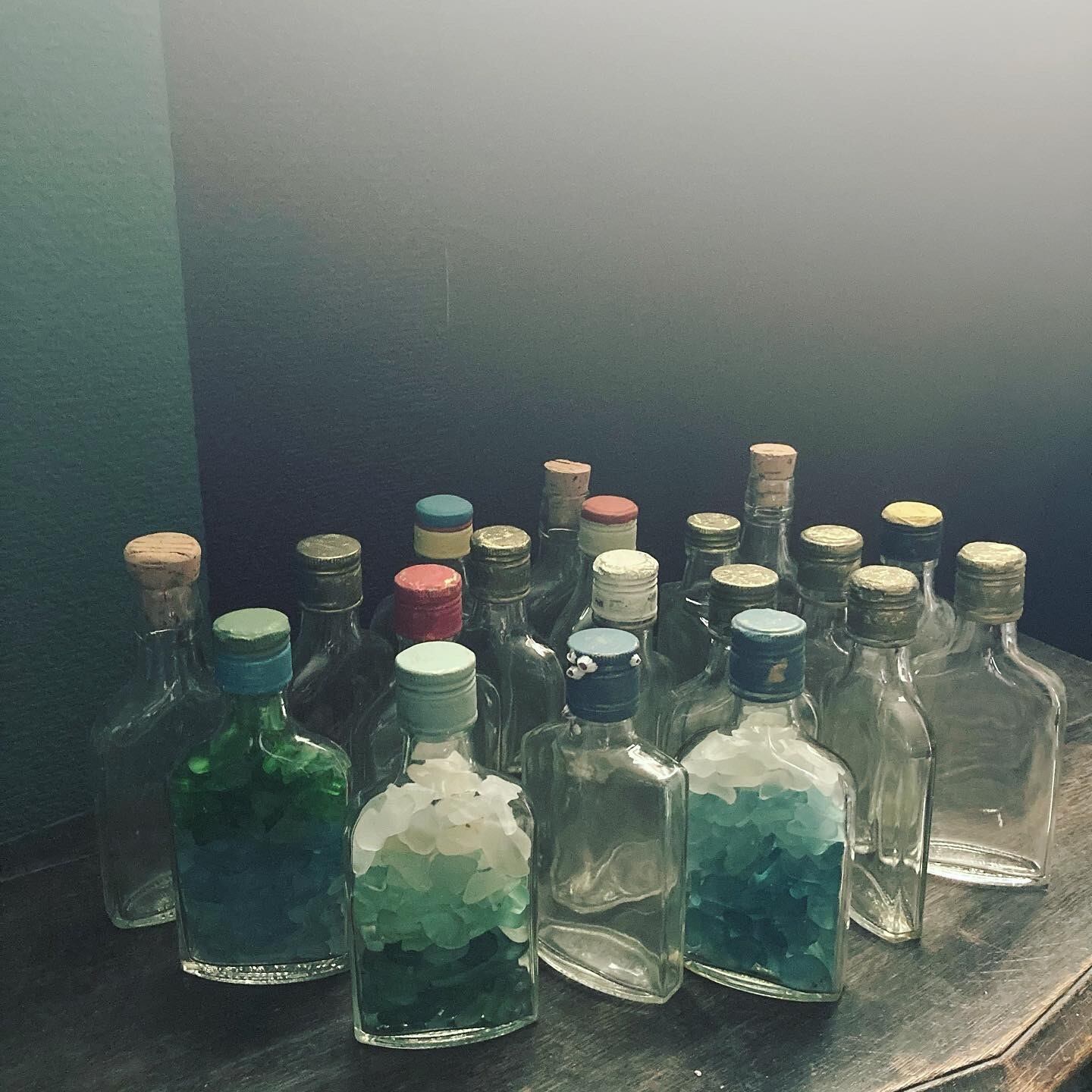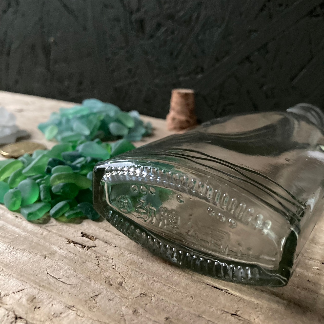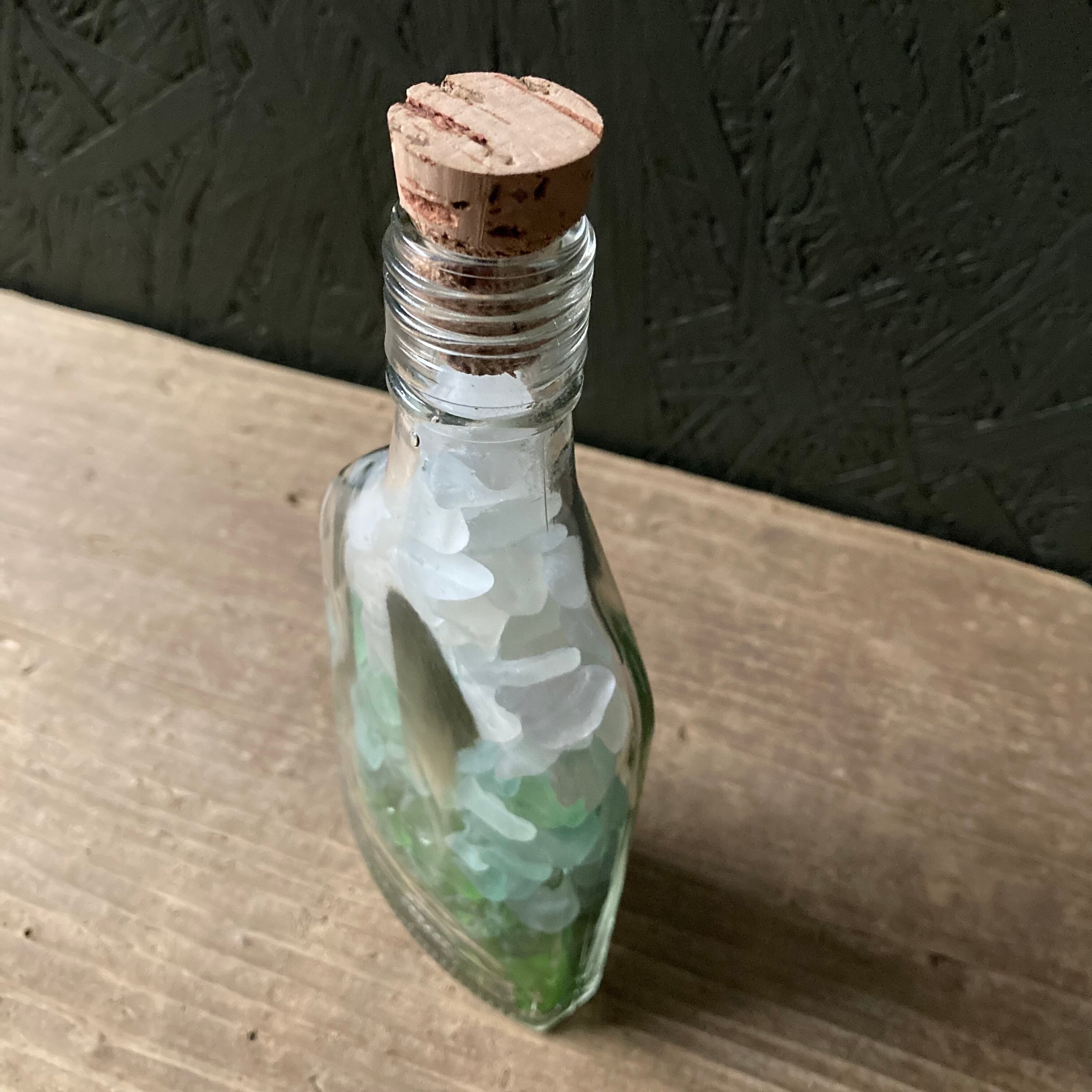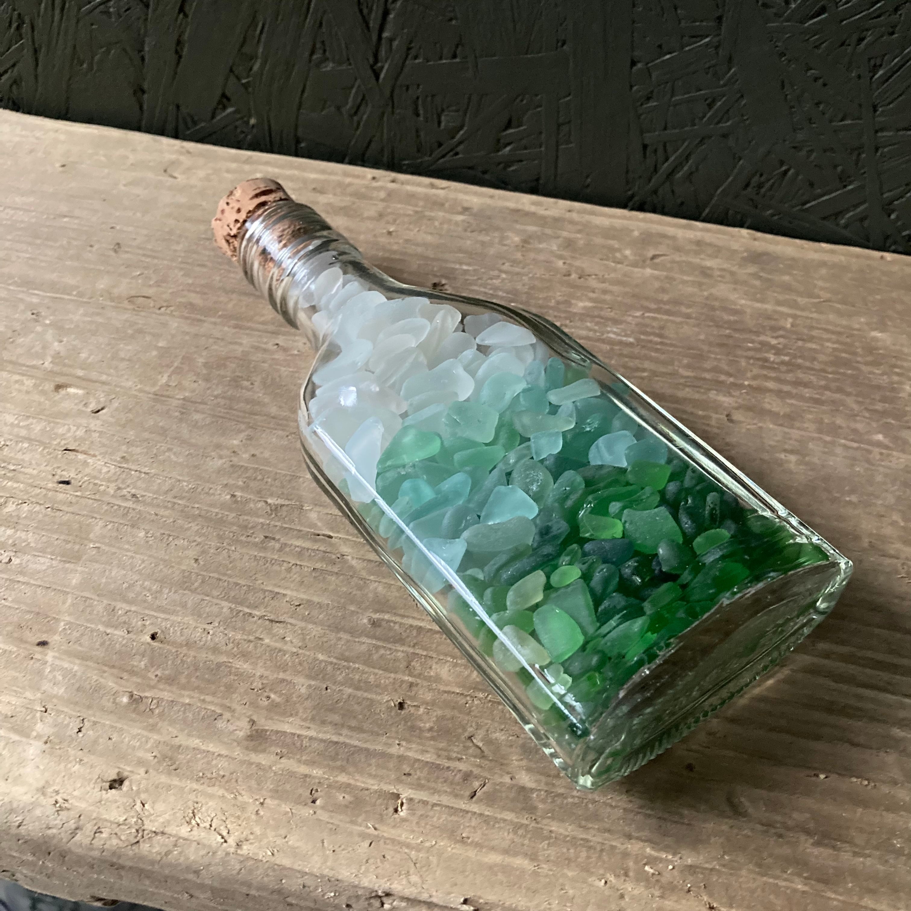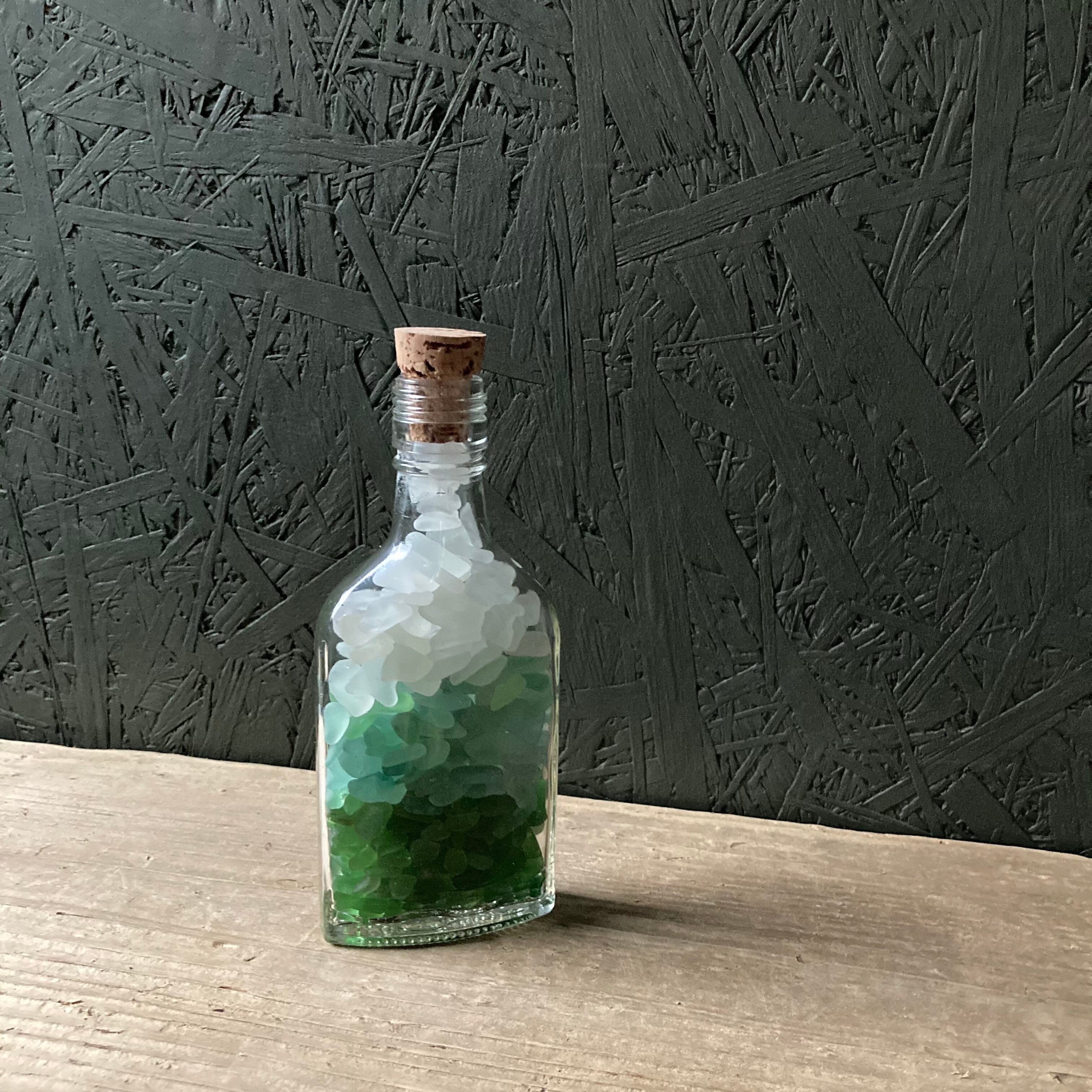 宮崎県のビーチにたどり着いたシーグラスと中国のウィスキーボトル。グリーン系のグラデーションになるように3色のシーグラスを入れてみました。