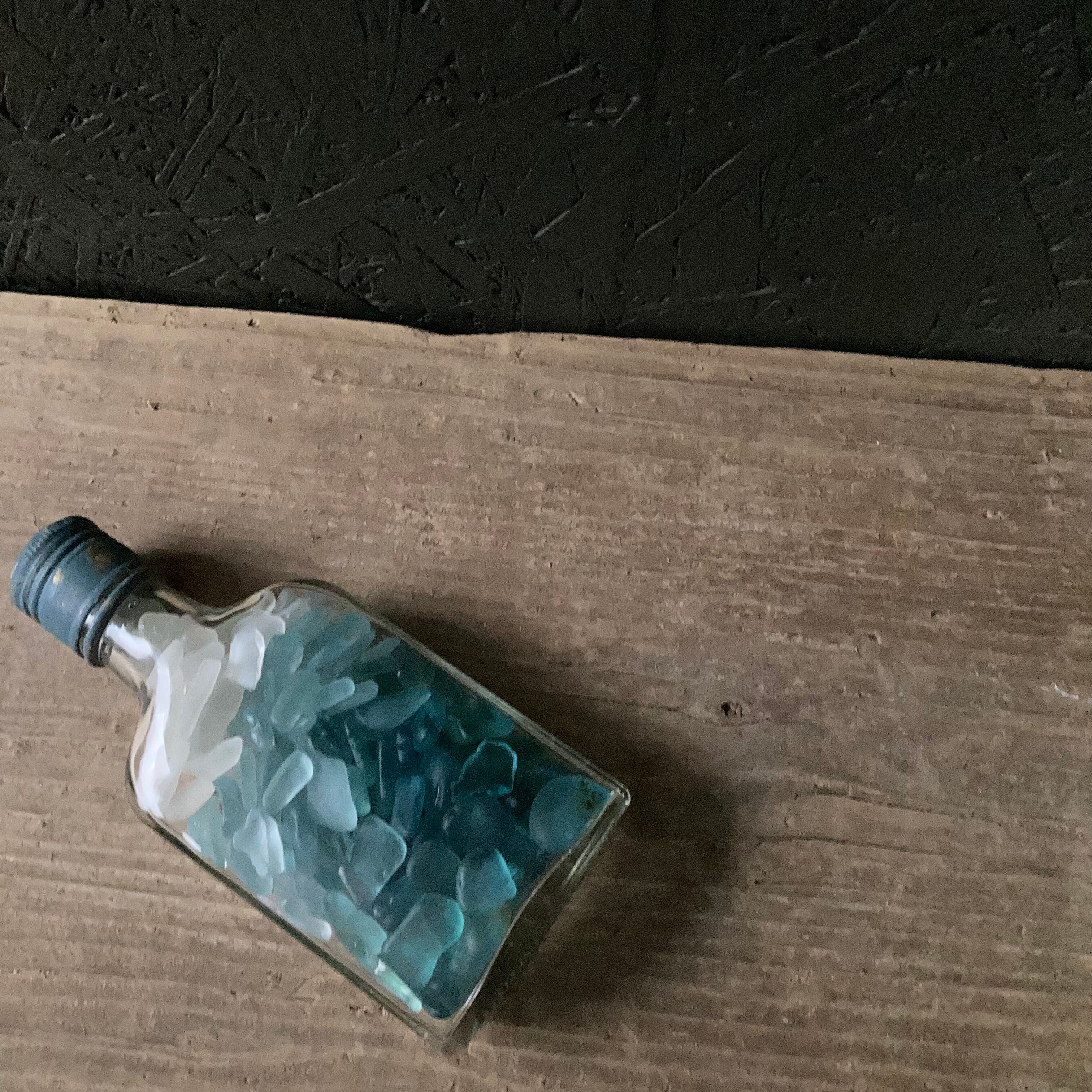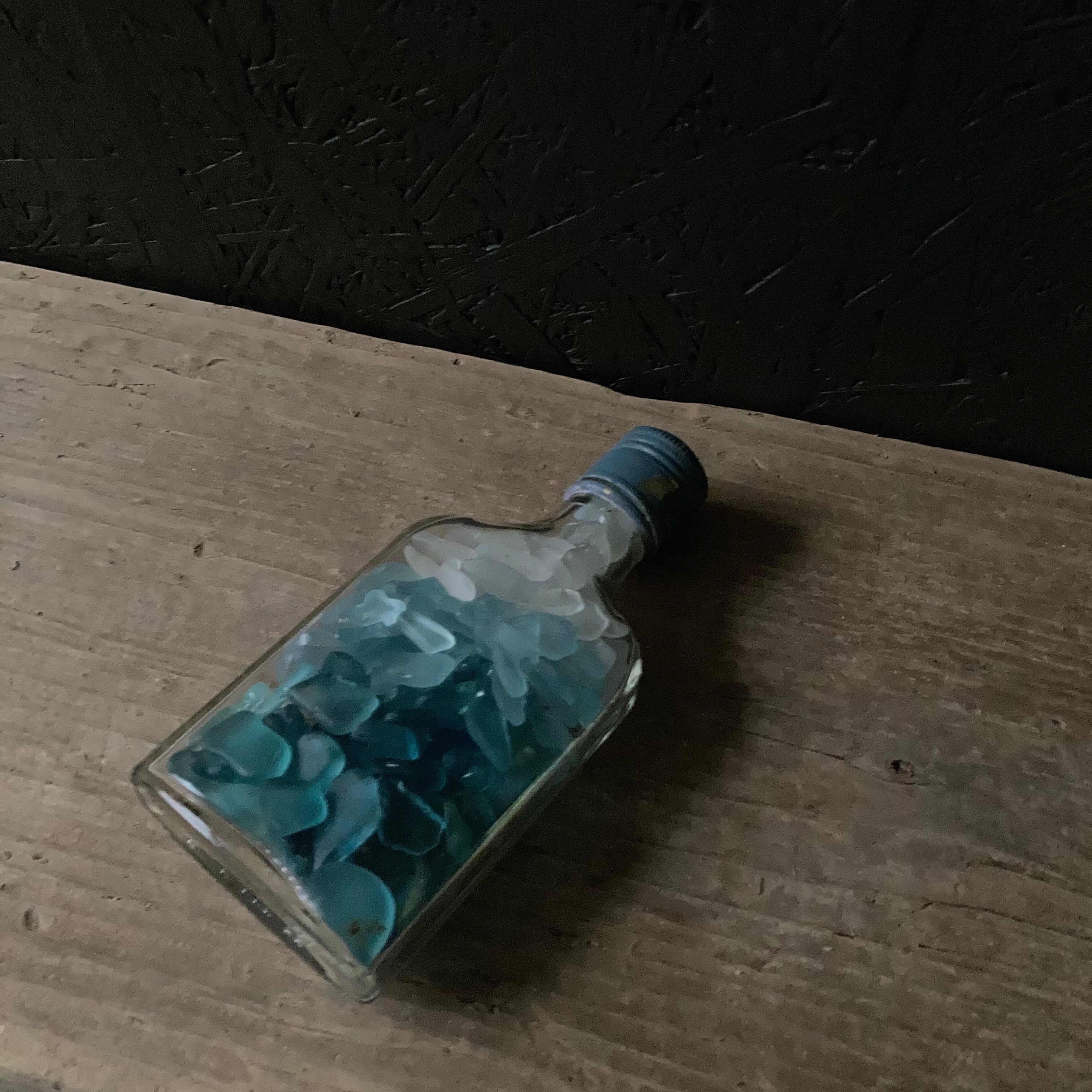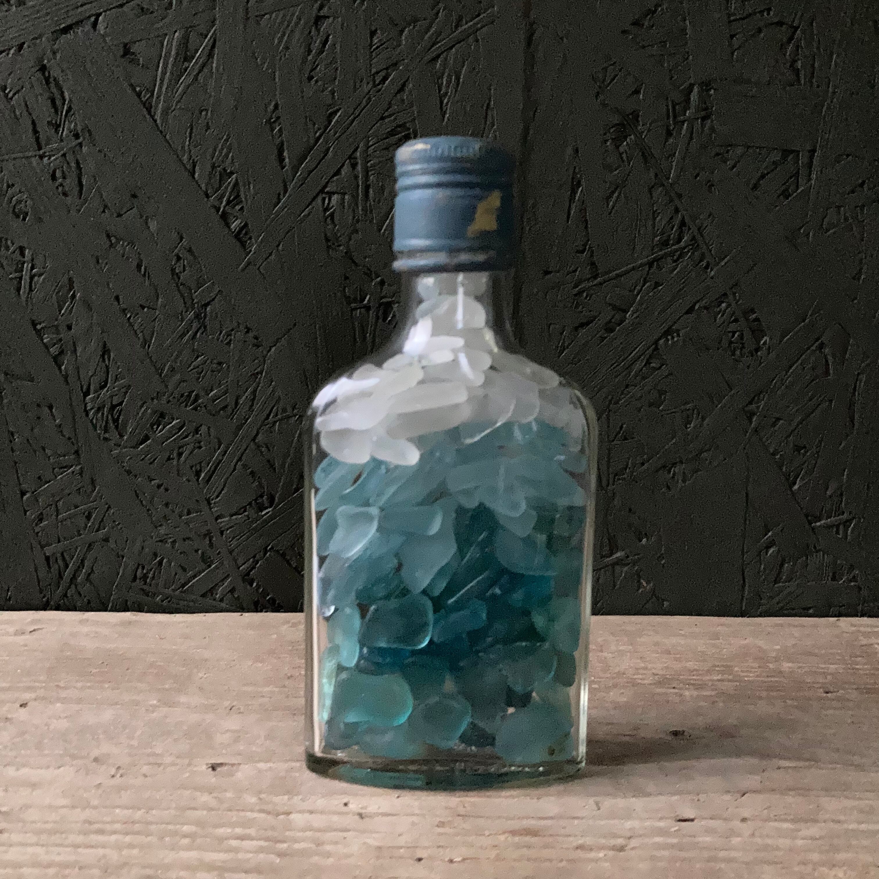 宮崎県のビーチにたどり着いたシーグラスと中国のウィスキーボトル。ブルー系のグラデーションになるように3色のシーグラスを入れてみました。