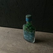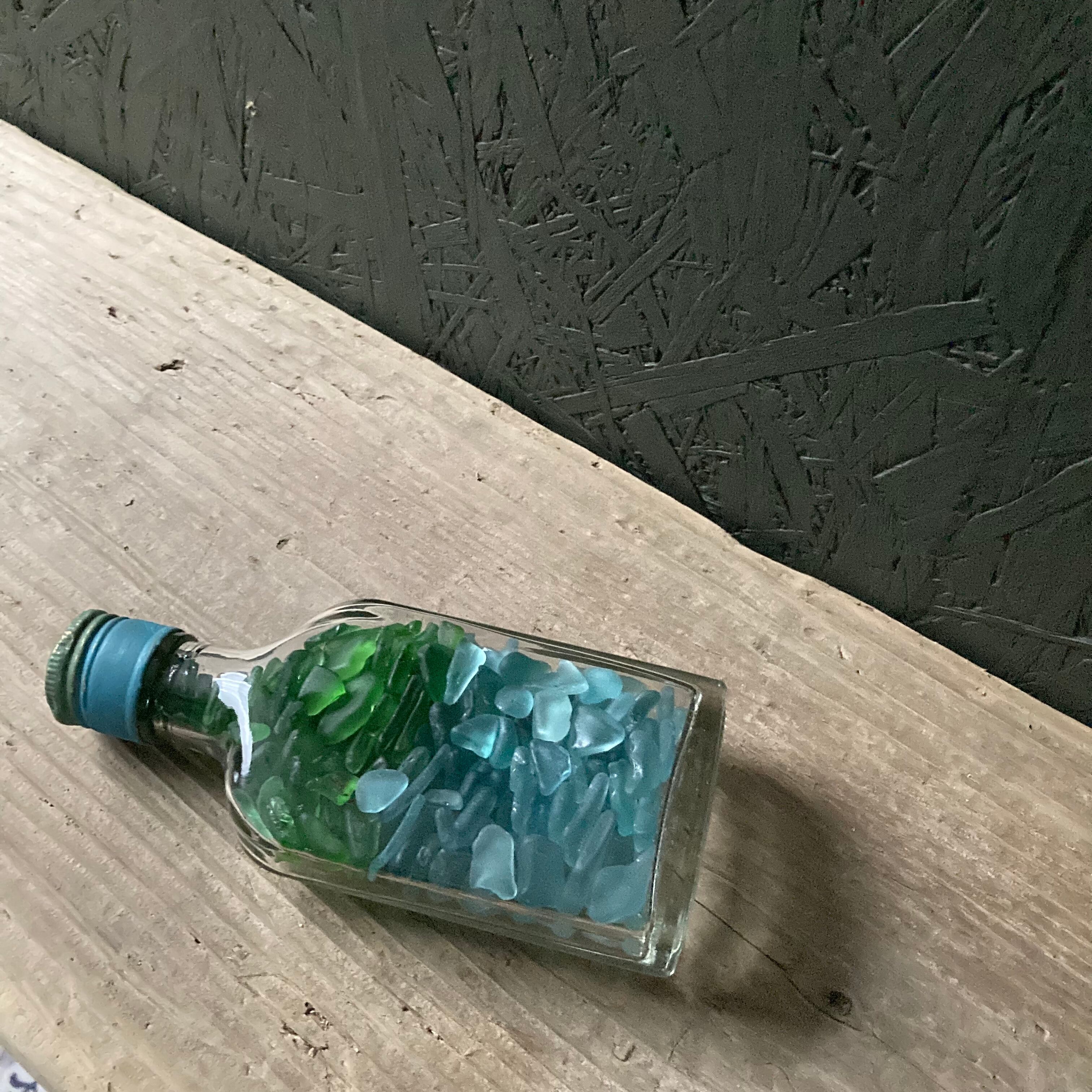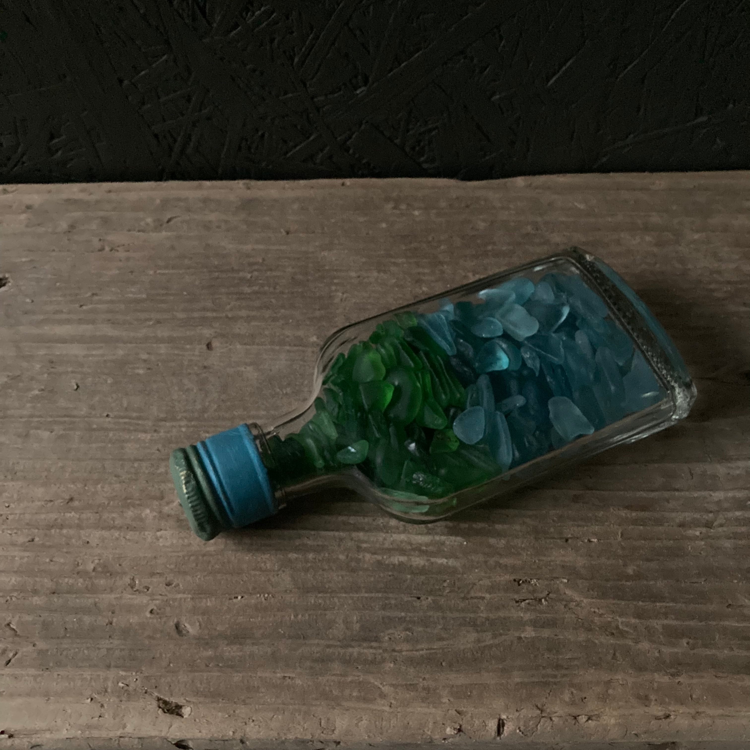 宮崎県のビーチにたどり着いたシーグラスと中国のウィスキーボトル。ブルーとグリーン2色のシーグラスを入れてみました。