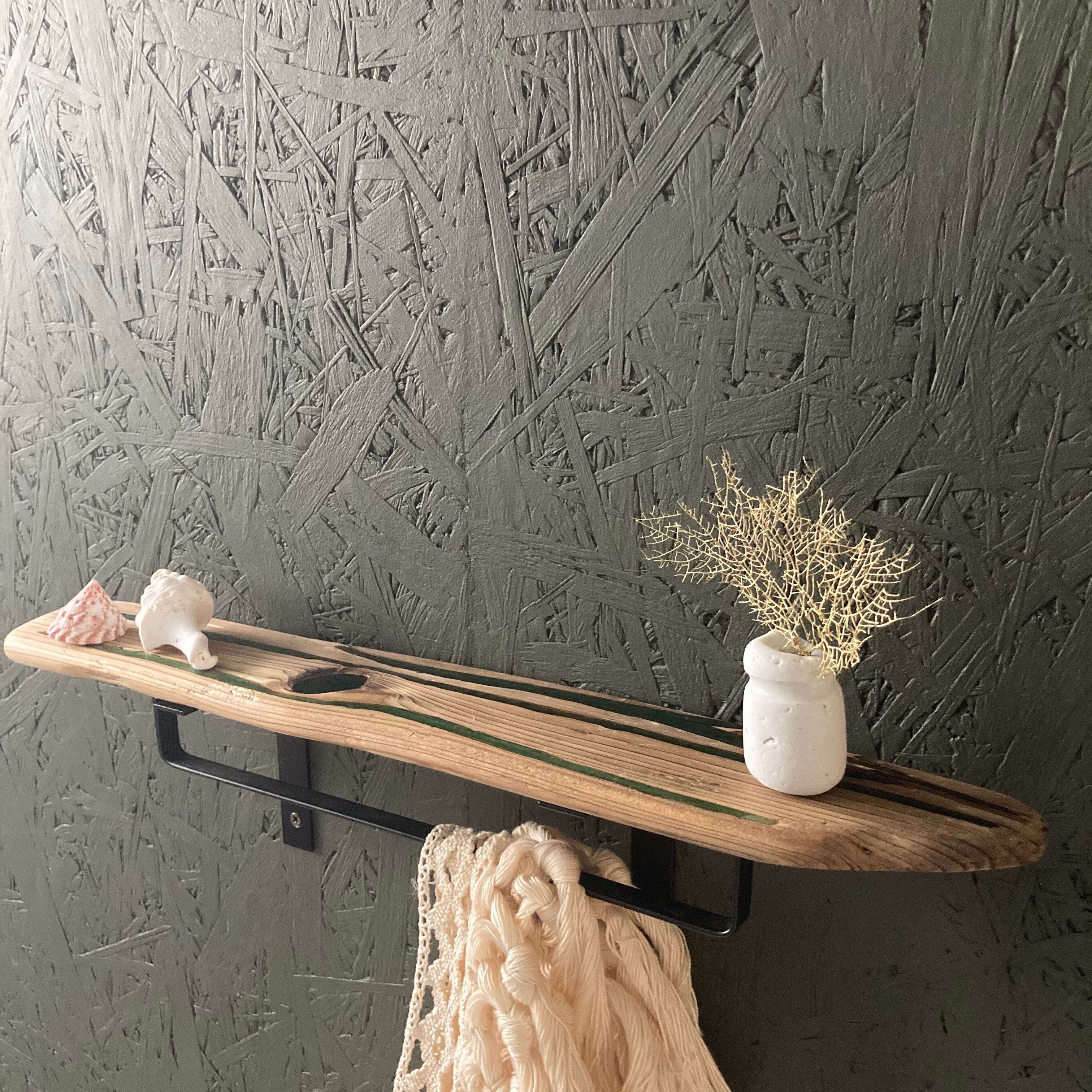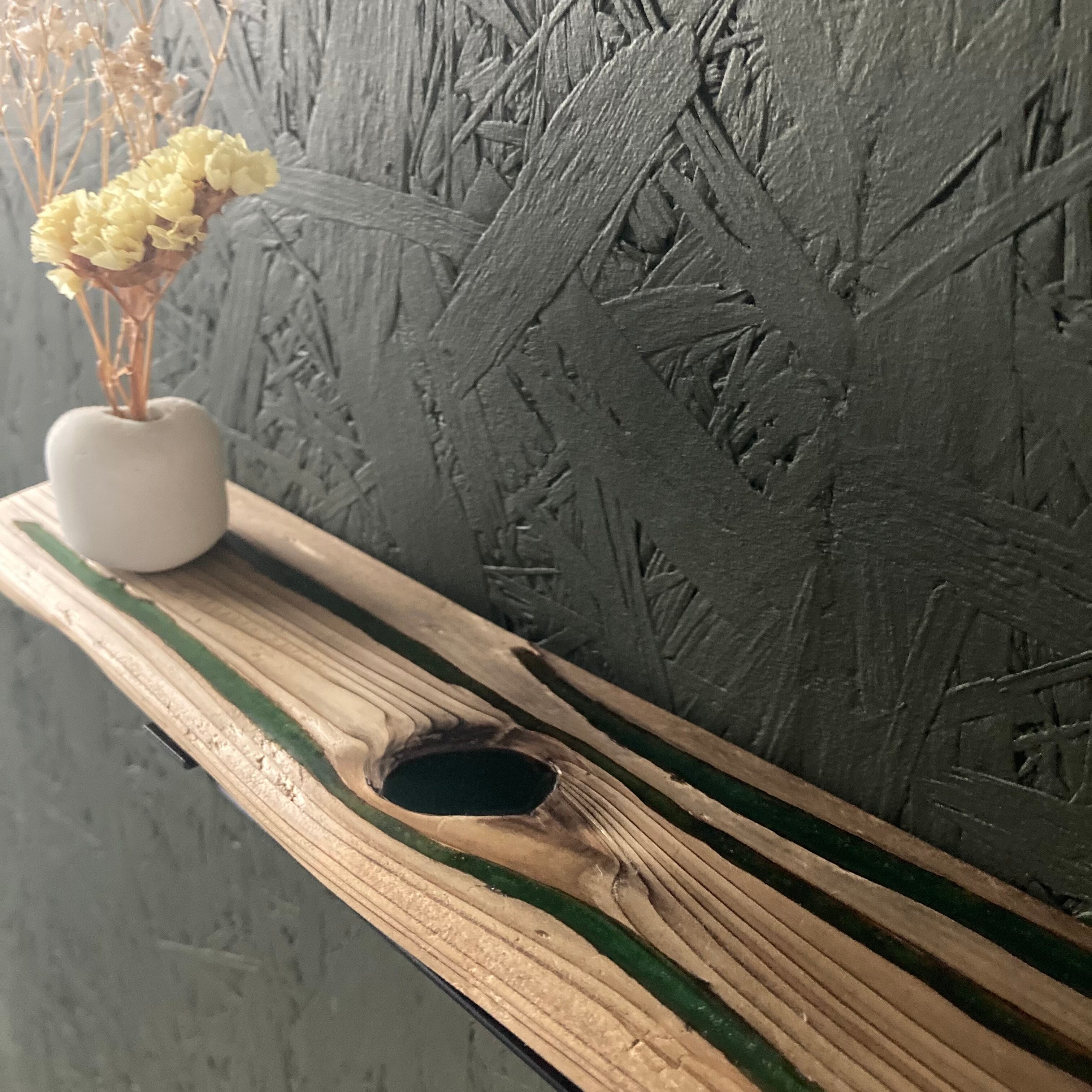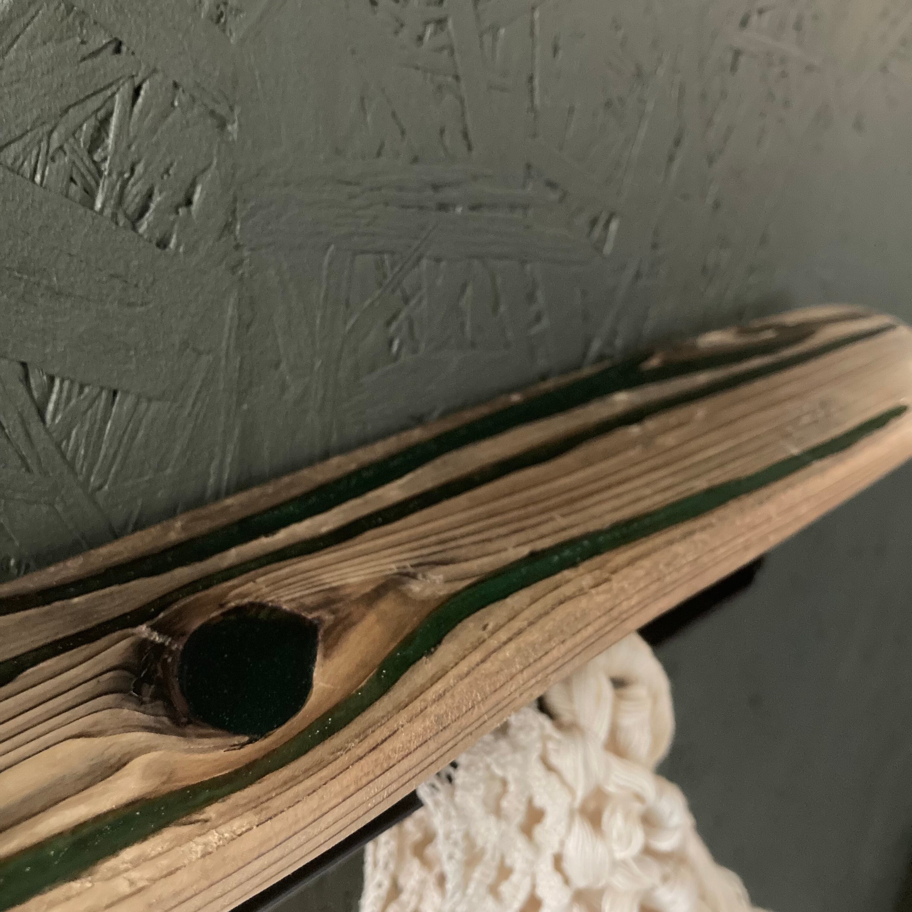 流木(流板)の表面に浮き出た畝にダークグリーンのレジンを流し込み、磨き上げ、ブラックアイアンのフックを取り付けてみました。