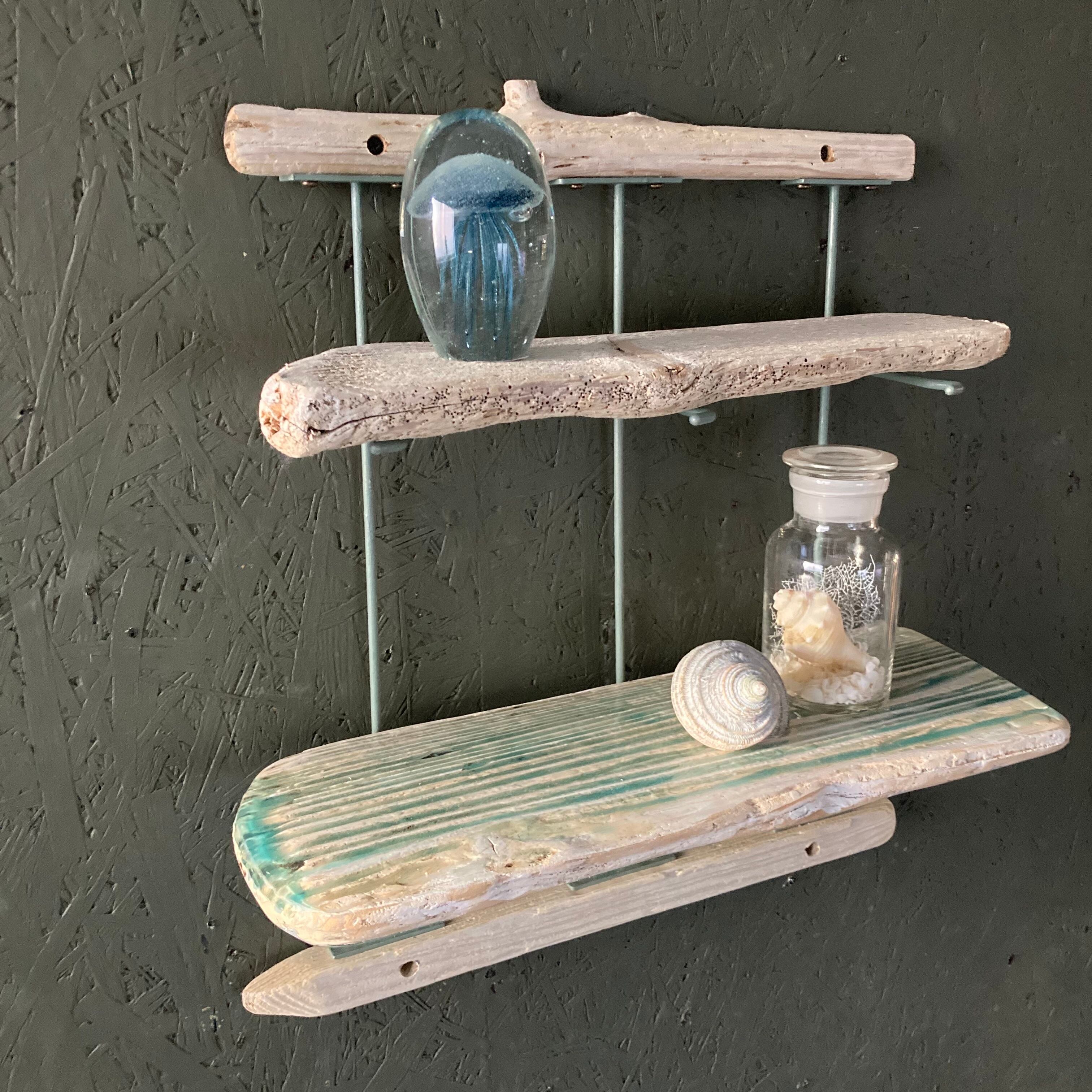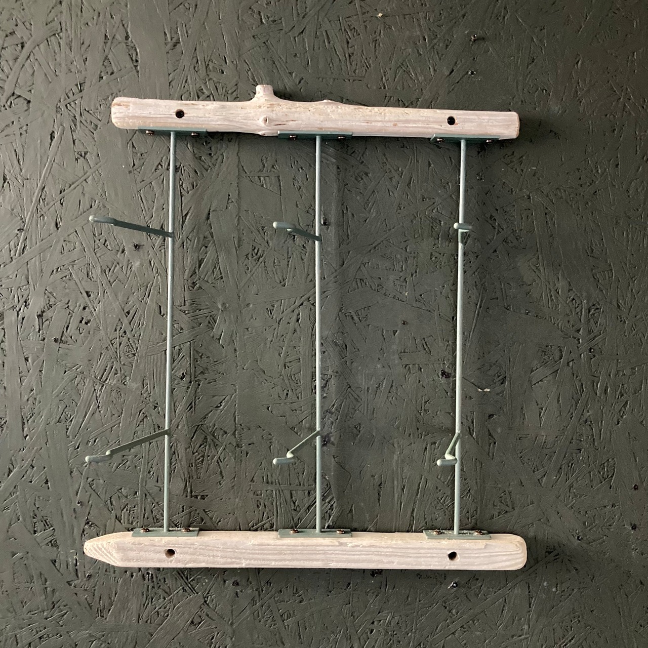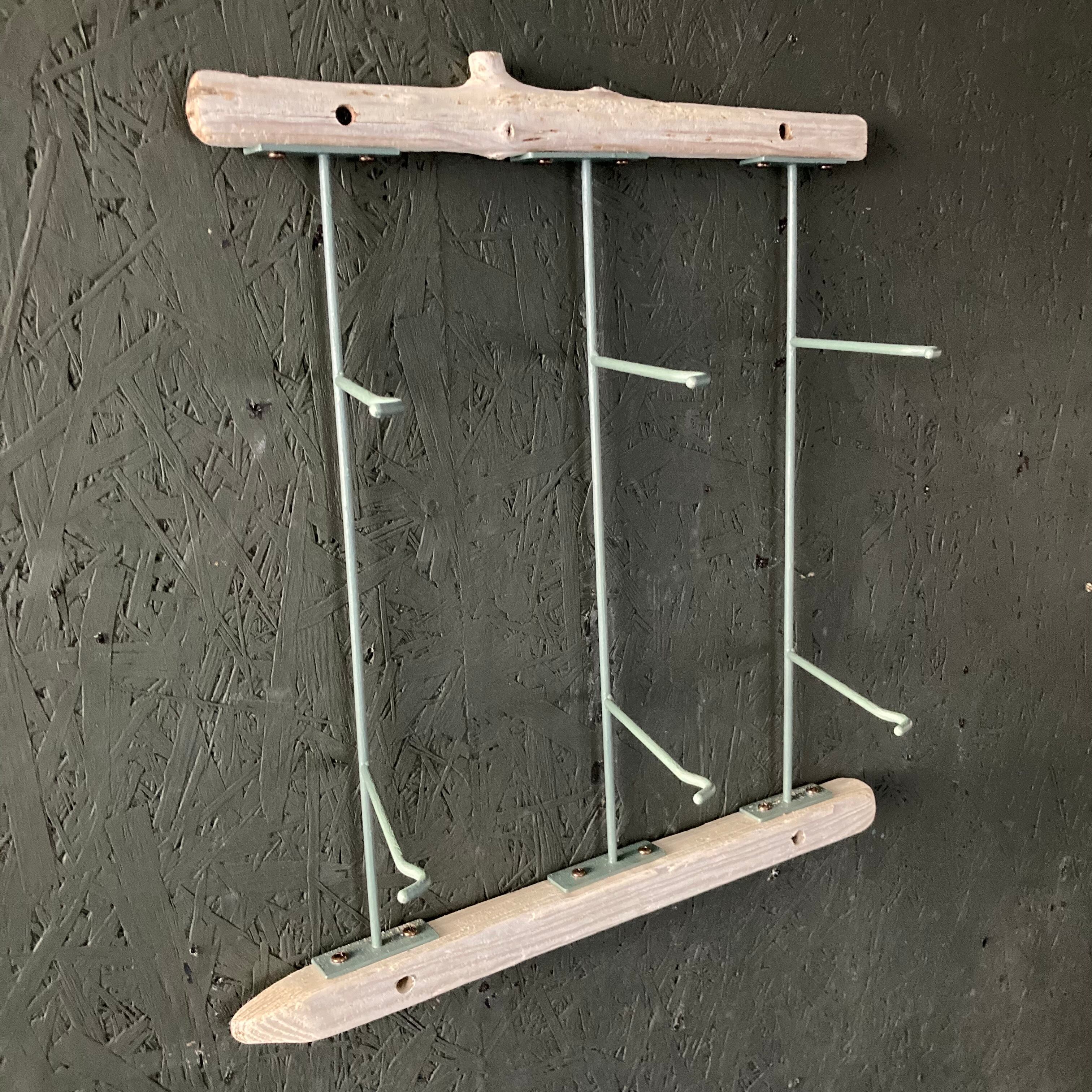什器として使われていたサングラスラックのアイアン部分を再利用し、流木と組み合わせてウォールラックにアップサイクルしました。