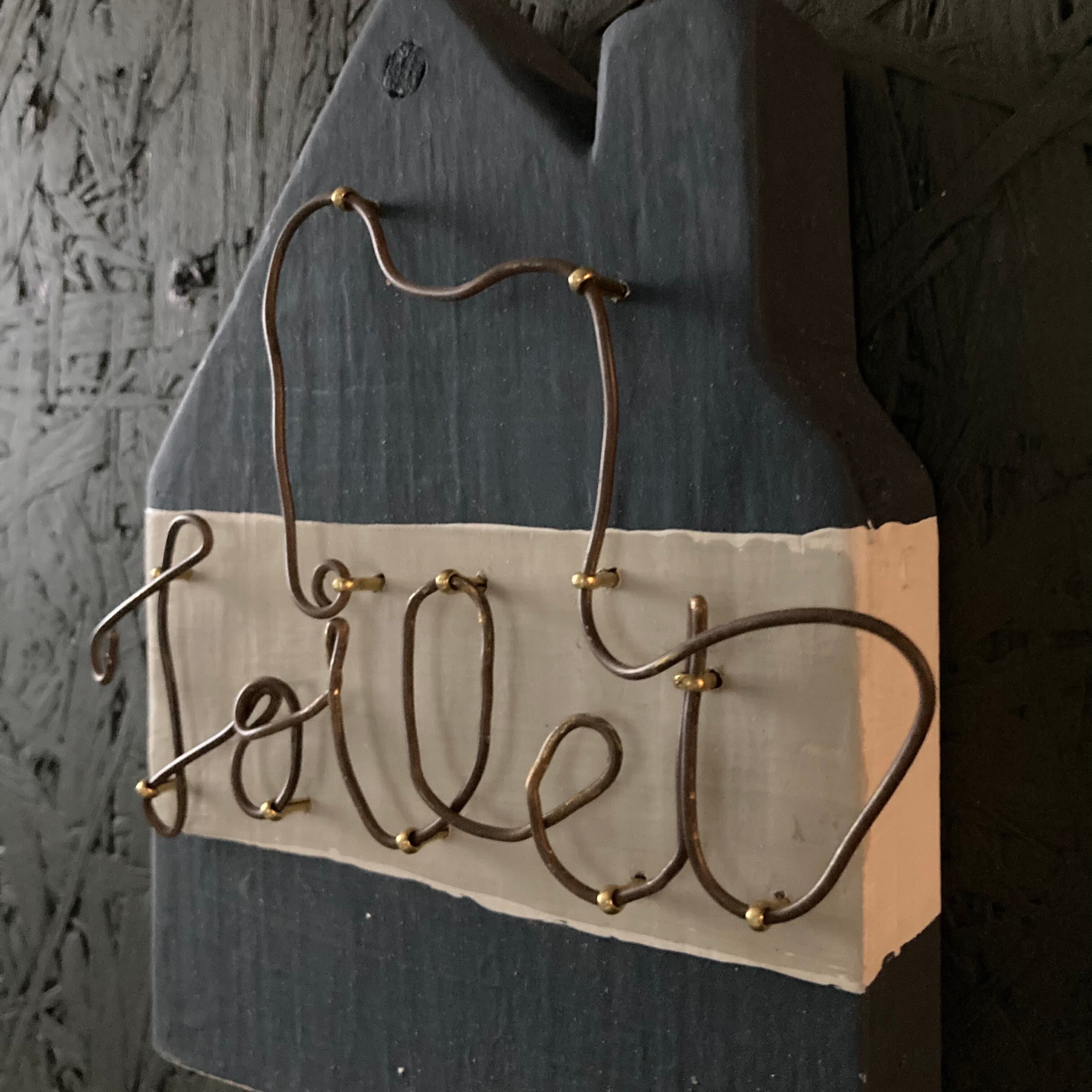 宮崎のビーチにたどり着いた廃棄されたワイヤーと木材で、「toilet」サインプレートを作ってみました。