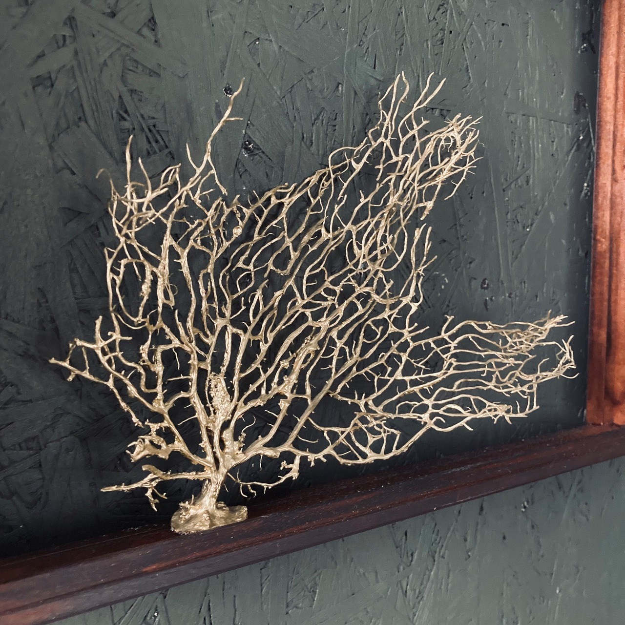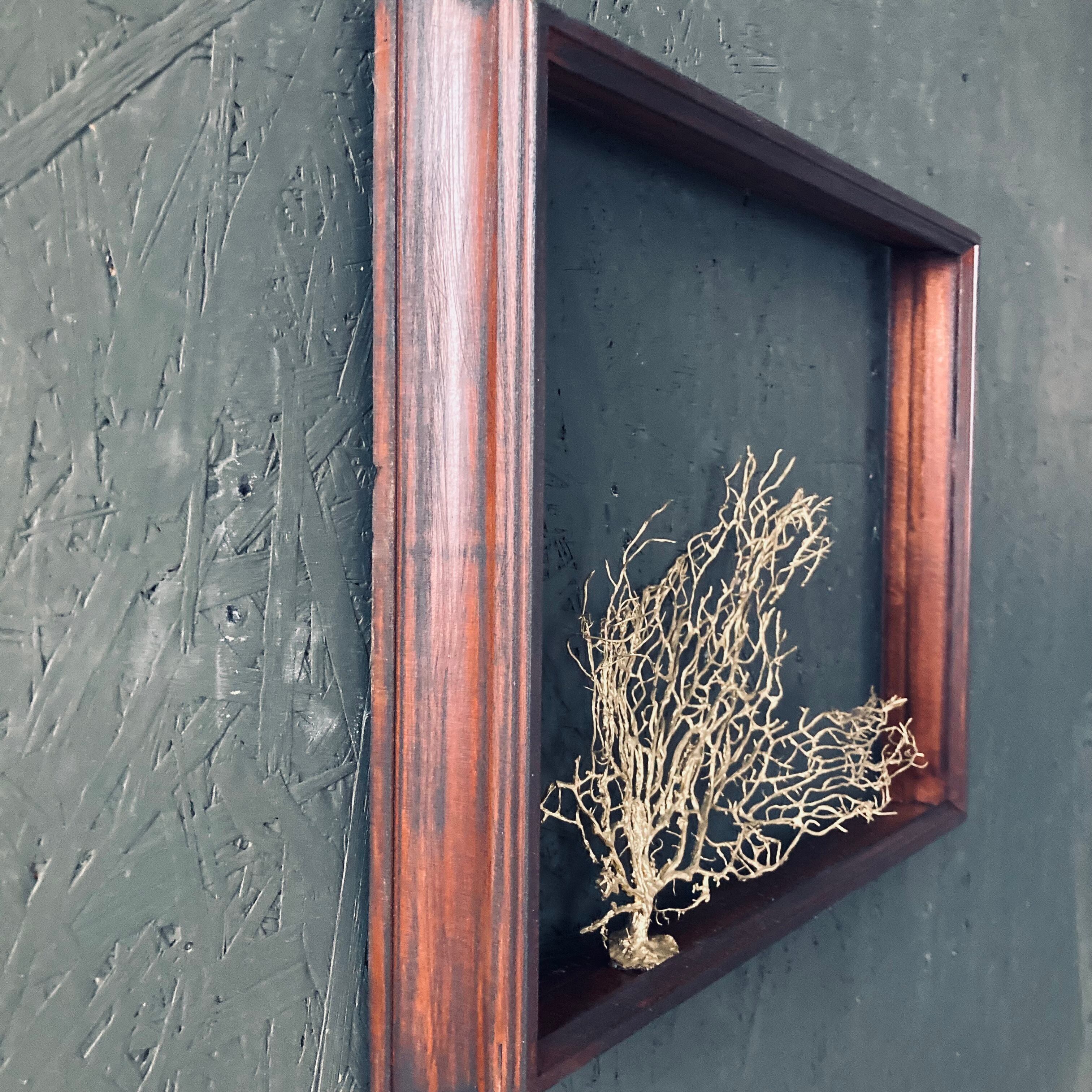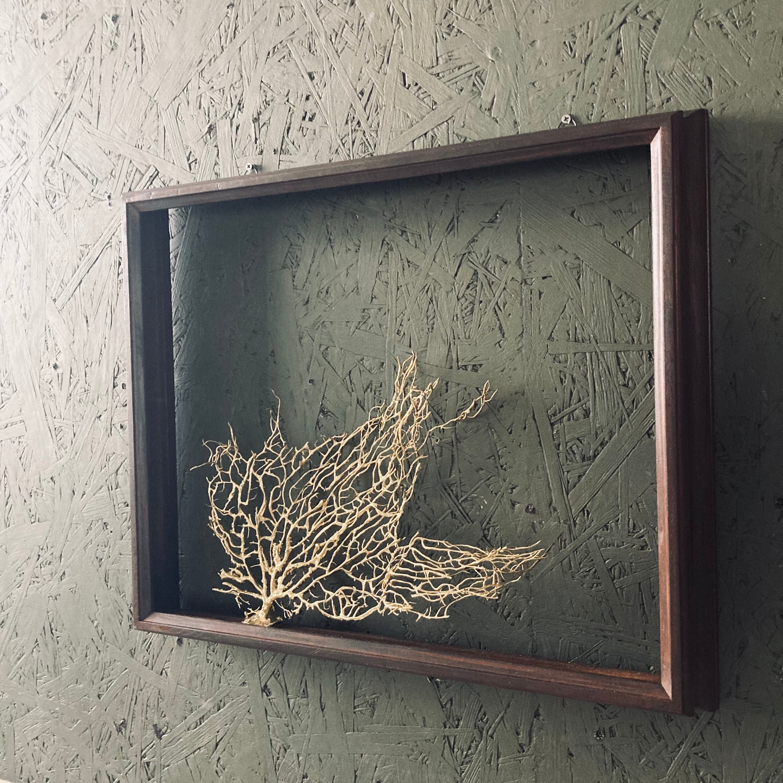 漁網にからまって打ち上がっていたものを網から丁寧に取り外しまし、古い額縁を再利用して壁掛けのオブジェとしてアップサイクルしてみました。