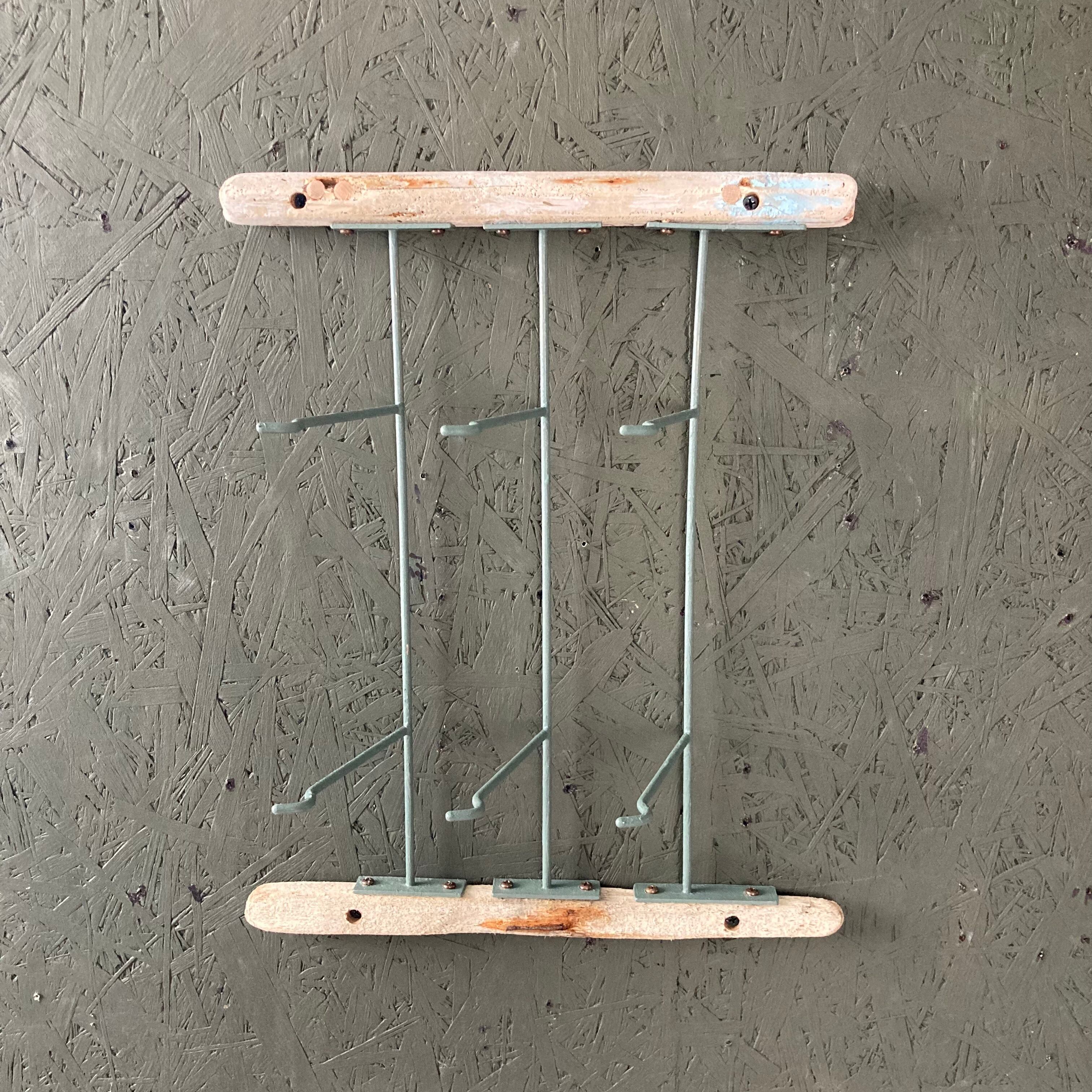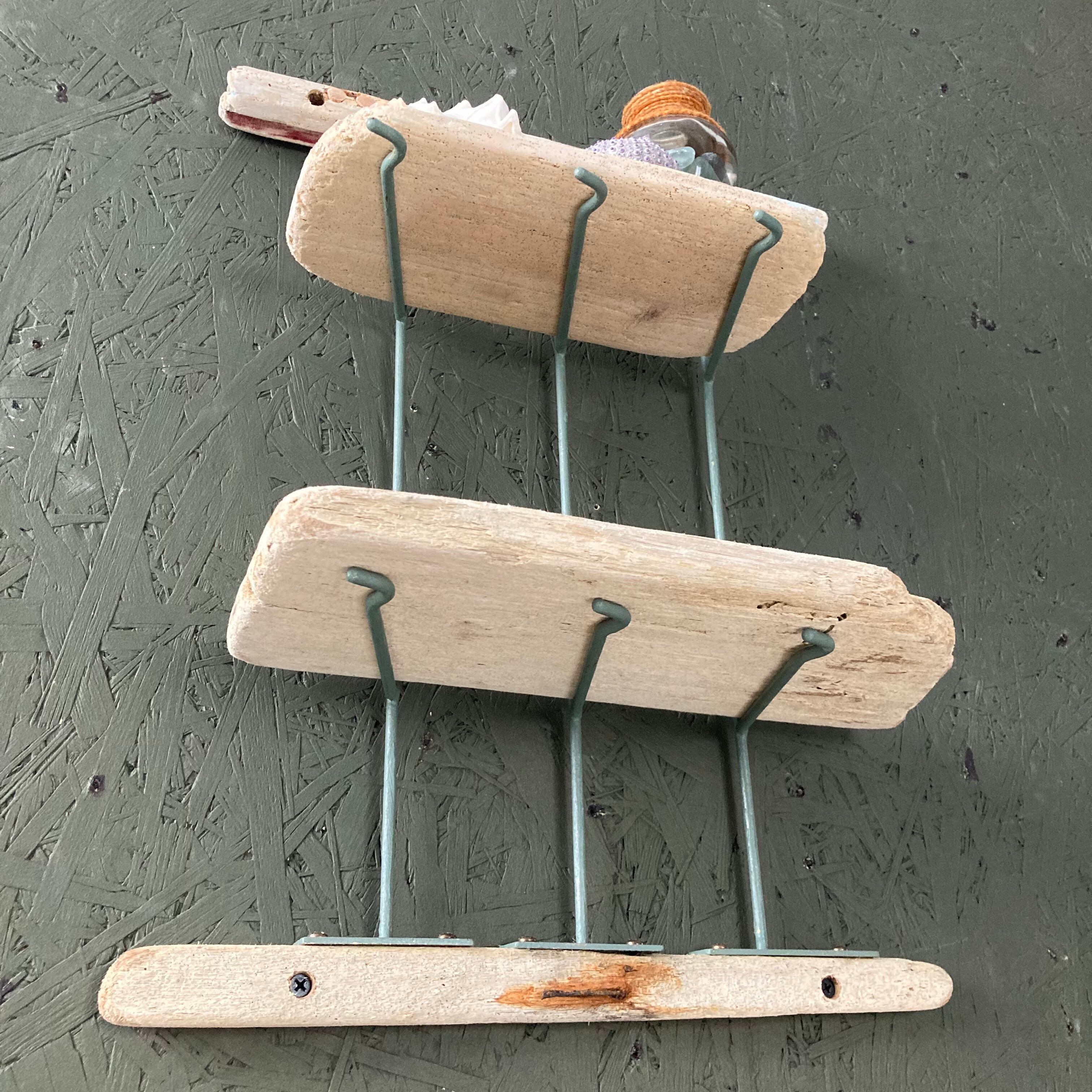 什器として使われていたサングラスラックのアイアン部分を再利用し、流木と組み合わせてウォールラックにアップサイクルしました。