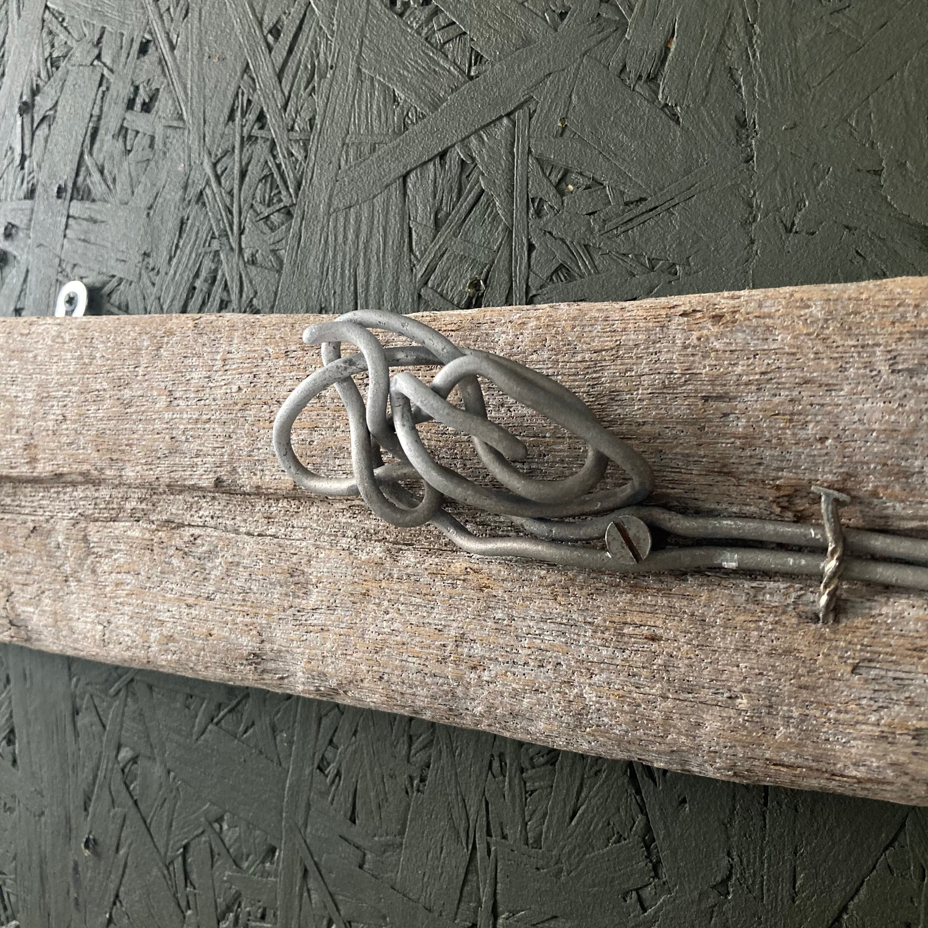 宮崎の海にたどり着いた流木の板と、ぐちゃっとヤレたワイヤー。