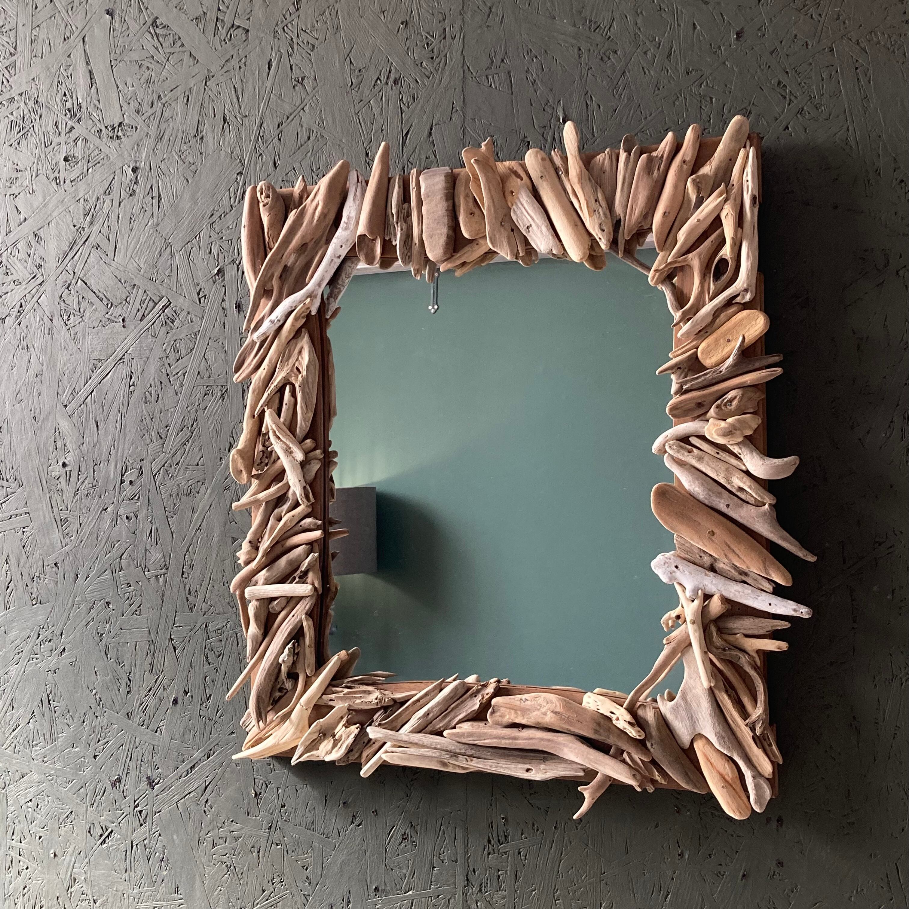 古家具の扉枠部分ベースに、小さな流木を敷き詰めて壁掛けミラーにアップサイクルしました。
