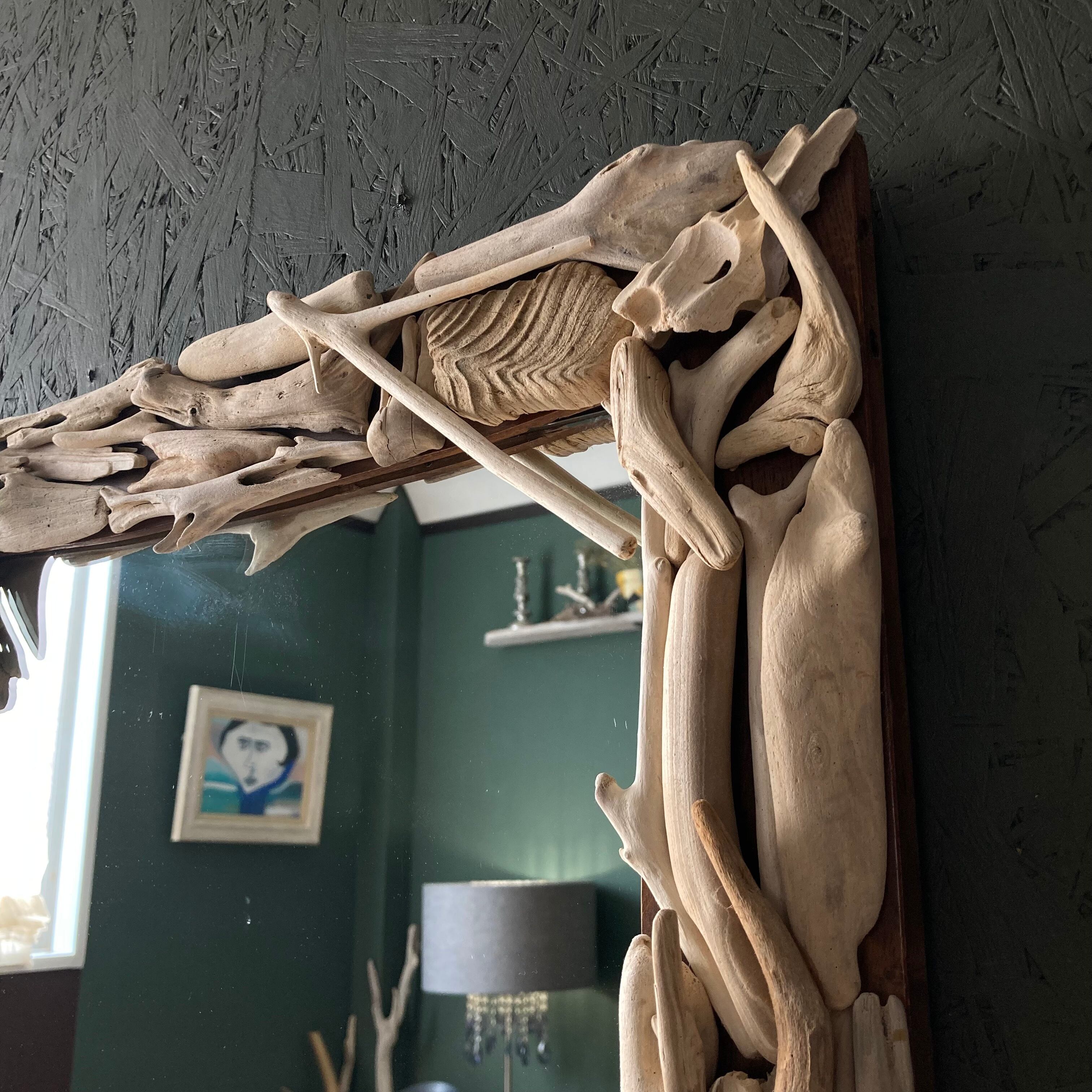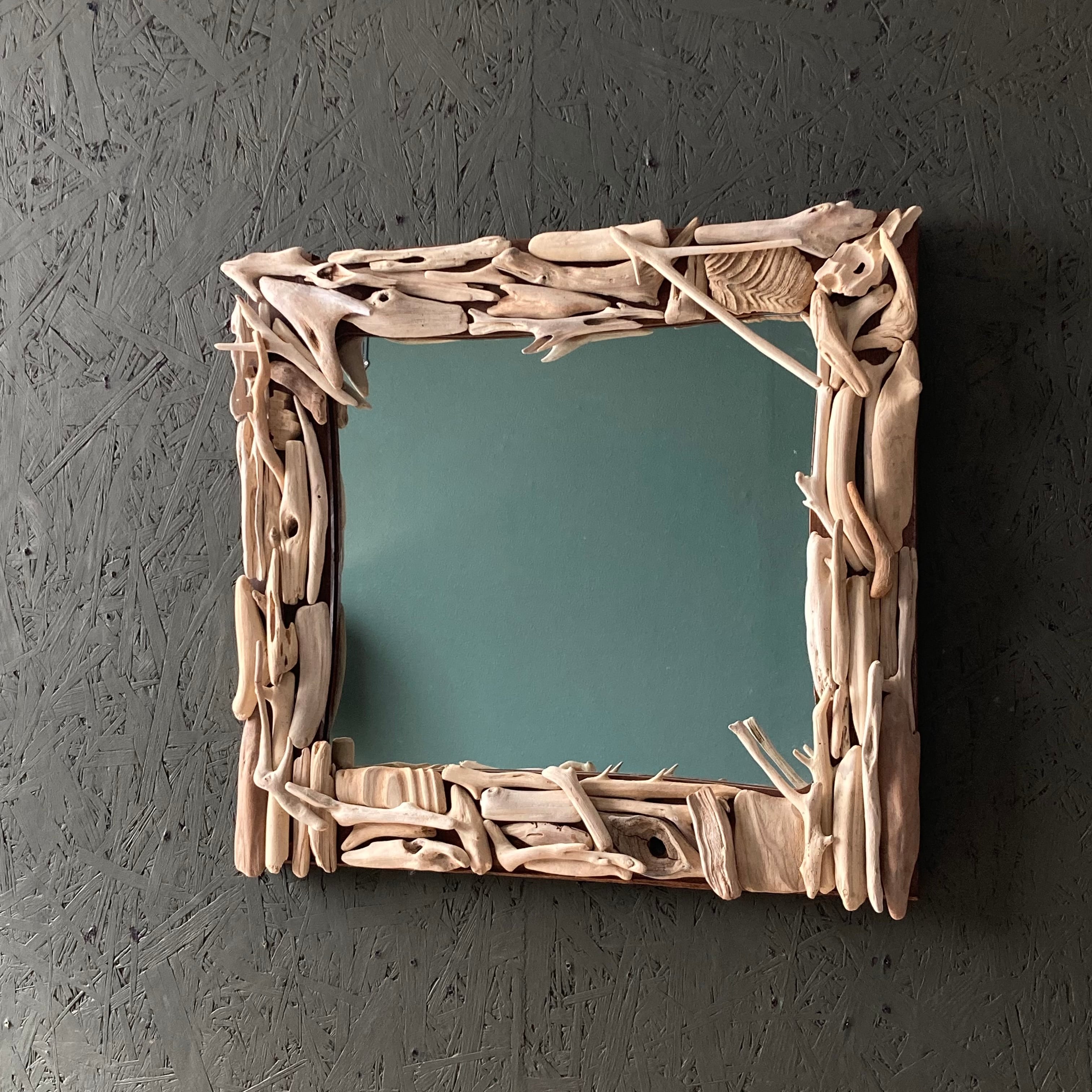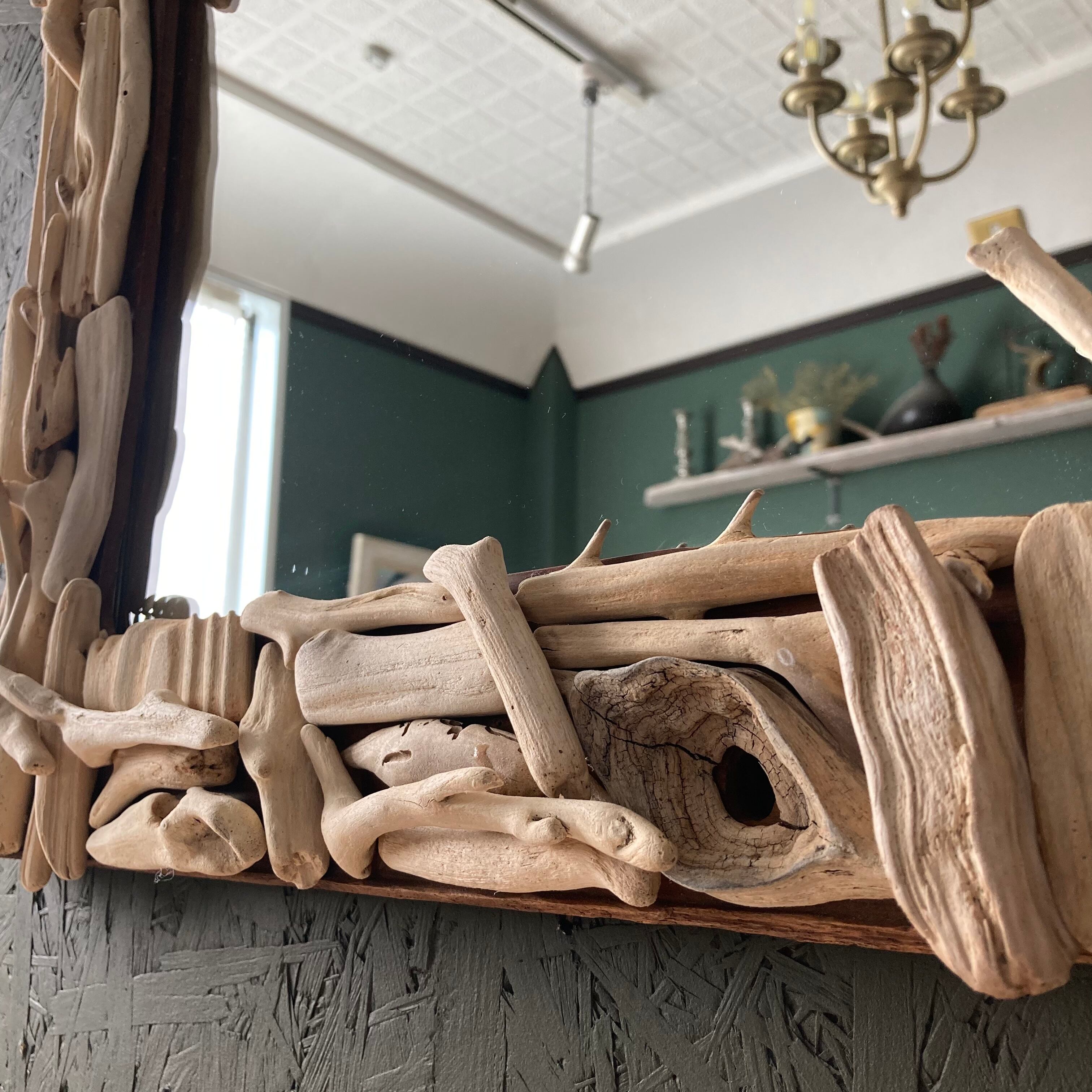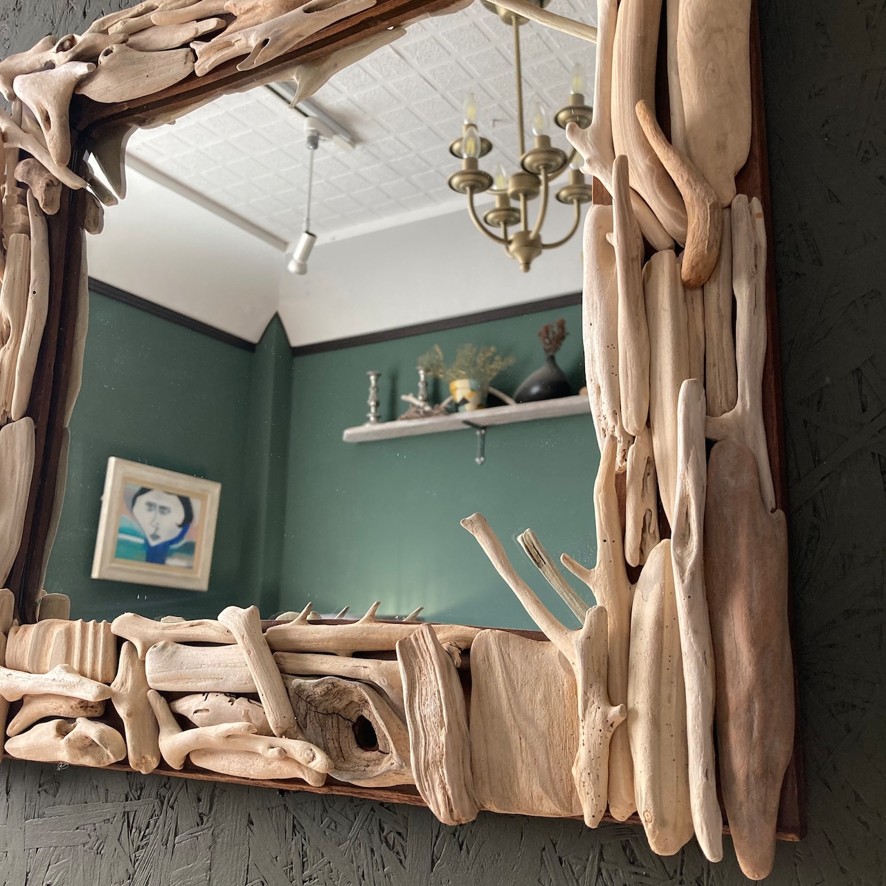 古家具の扉枠部分ベースに、小さな流木を敷き詰めて壁掛けミラーにアップサイクルしました。