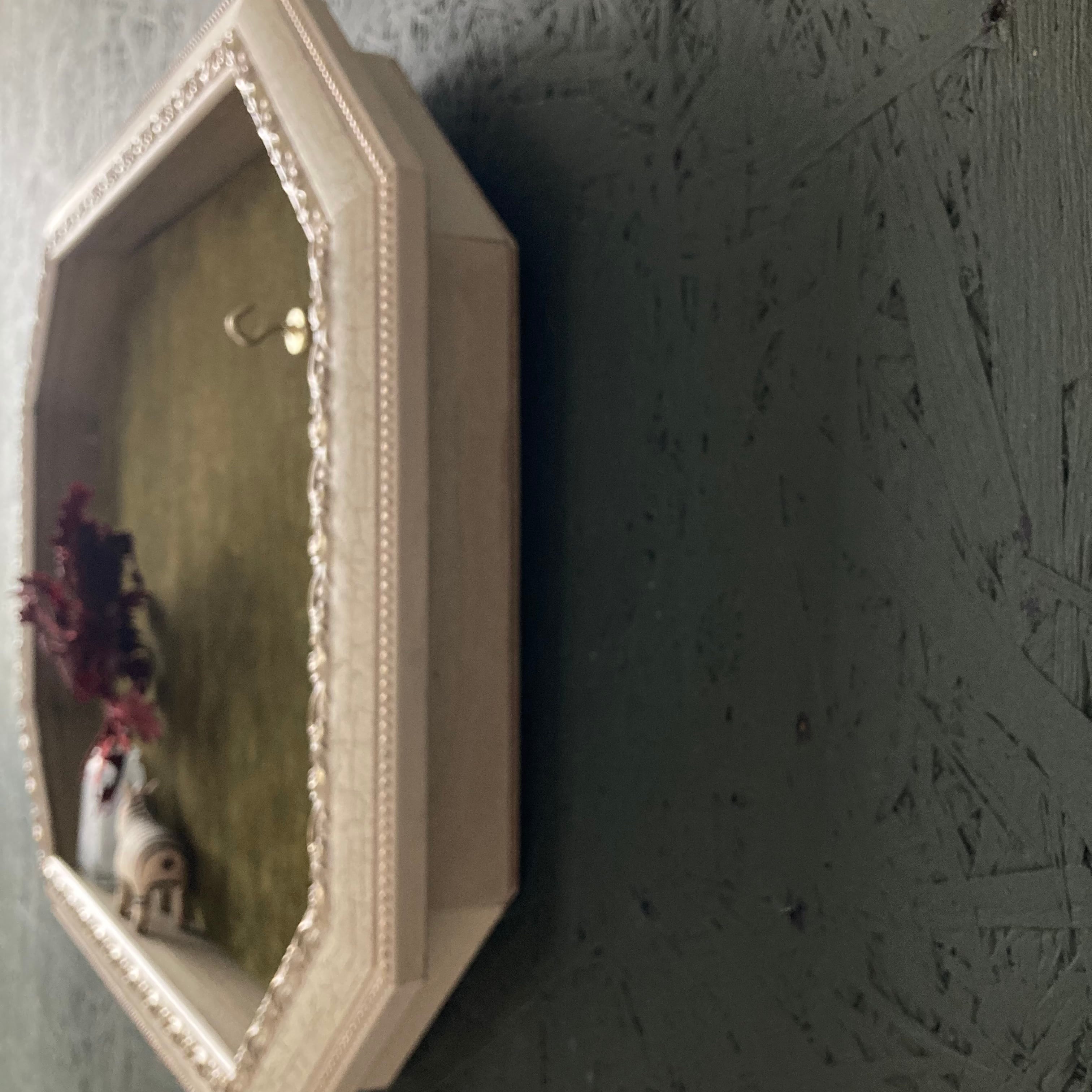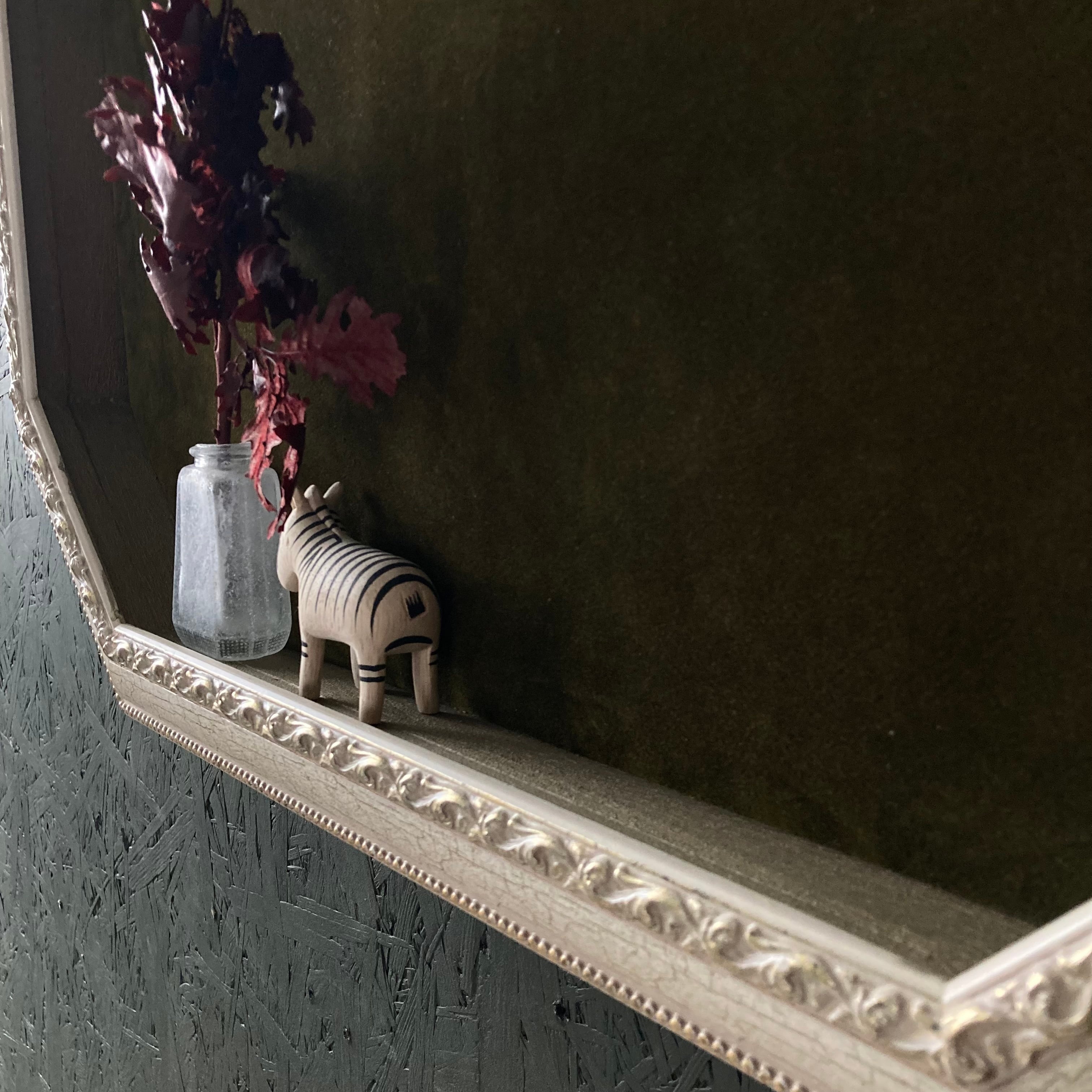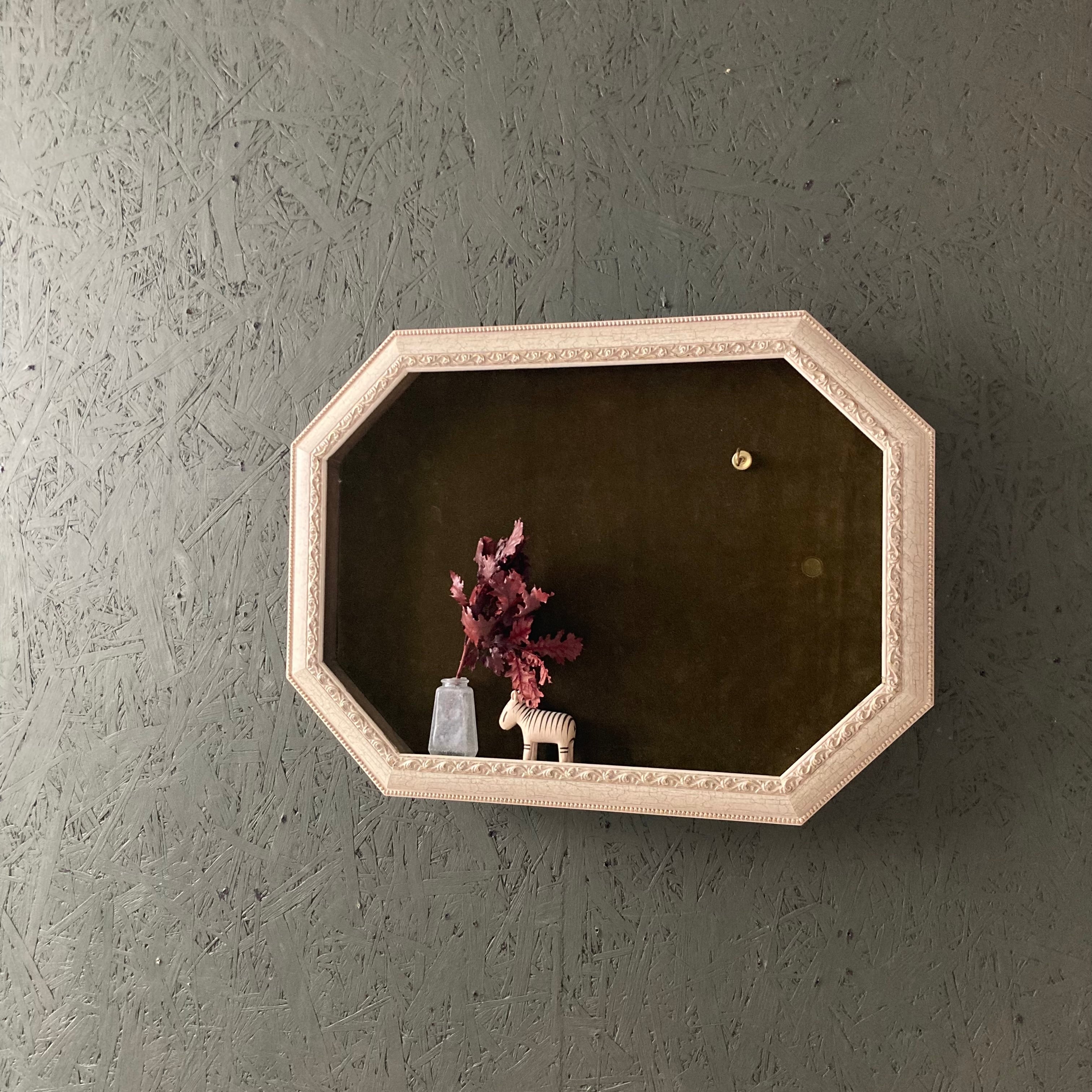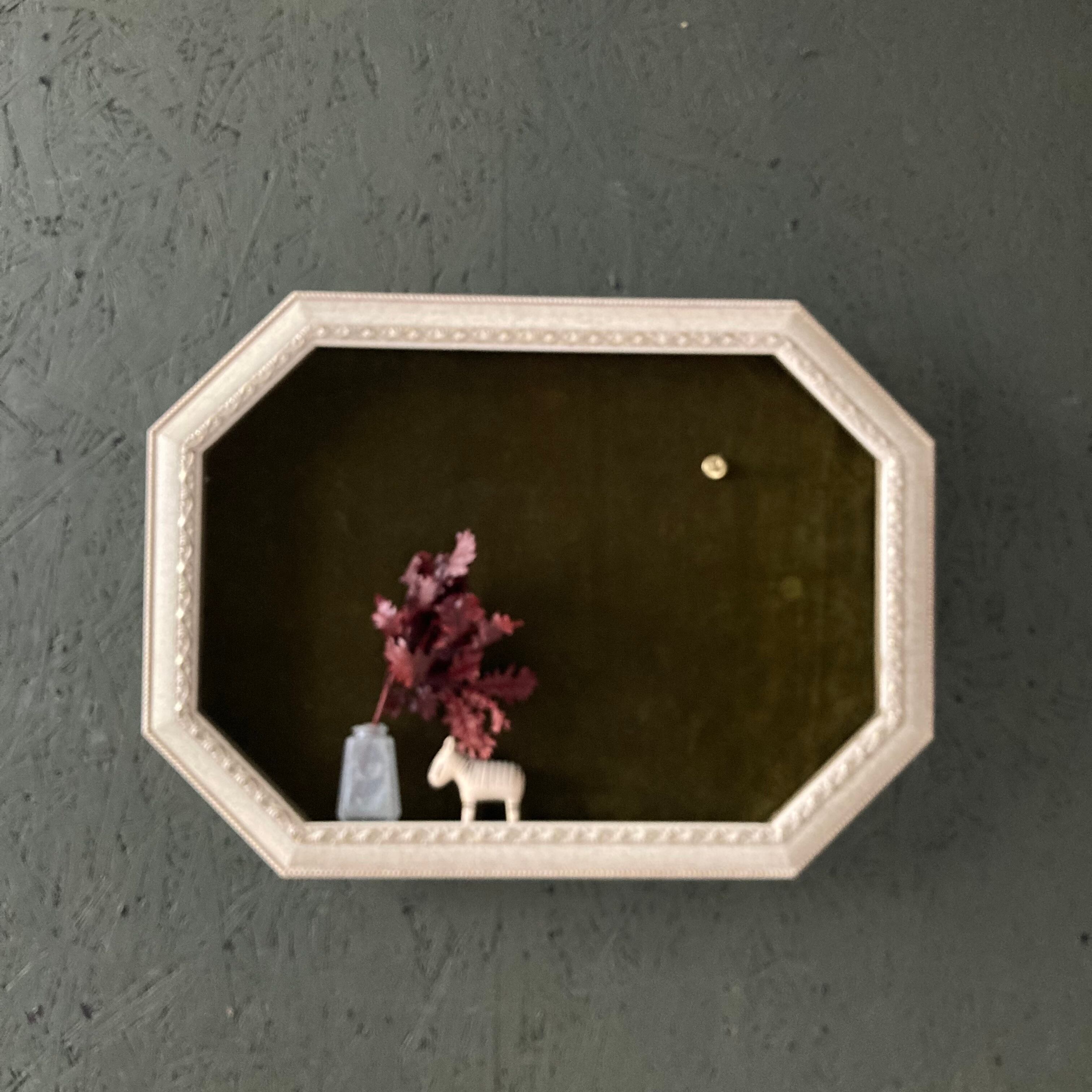 もともとはイタリー製の壁掛けミラーだったフレームを再利用して、奥行きと棚板をつけ、背板にはマグネットボードを入れてアップサイクルしてみました。