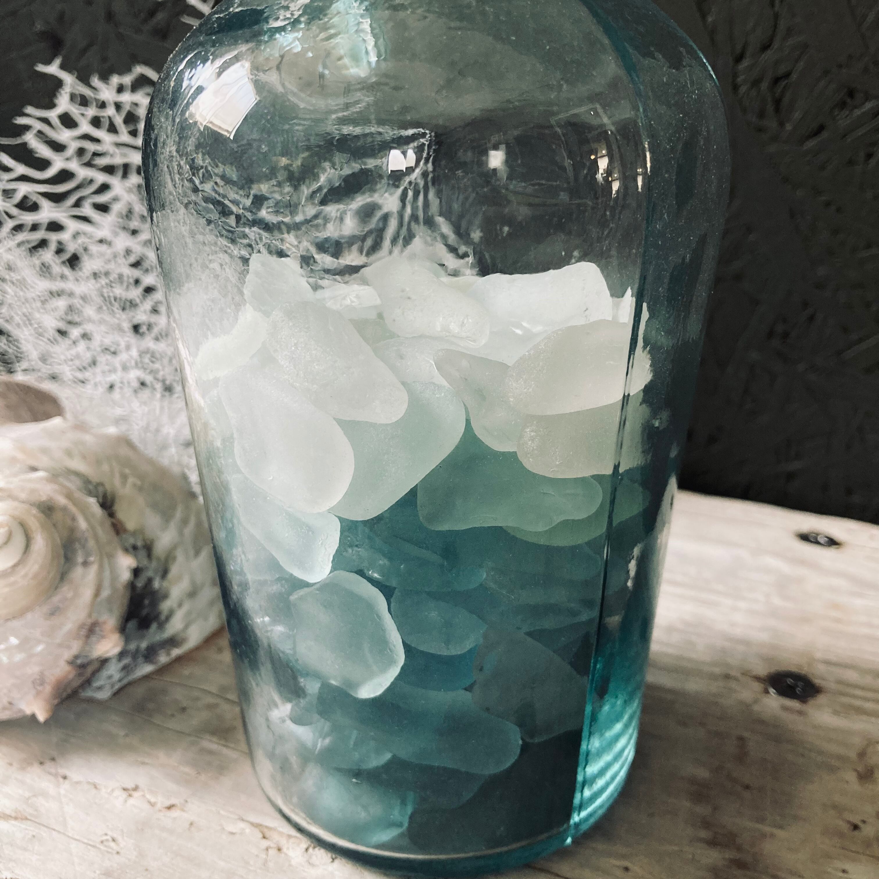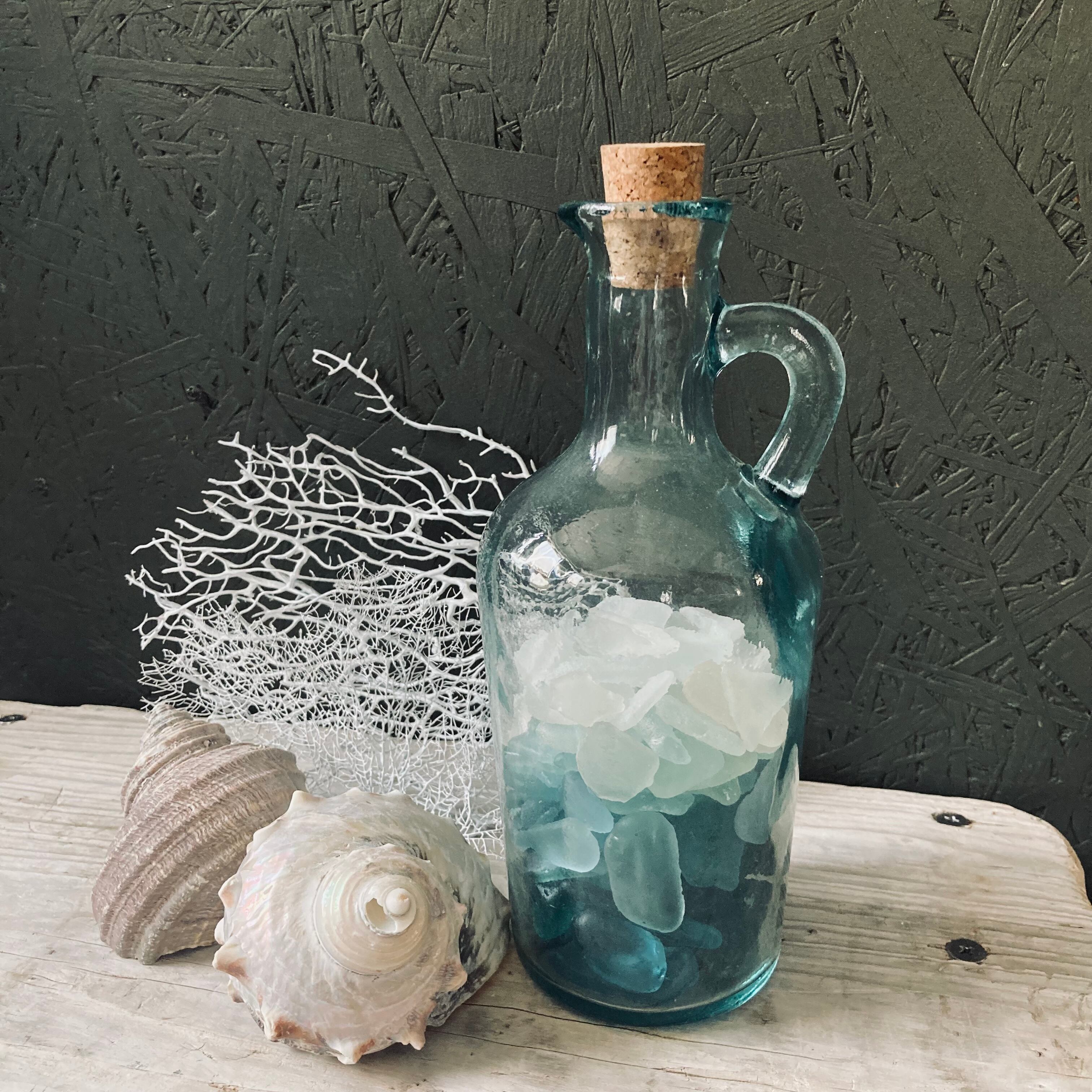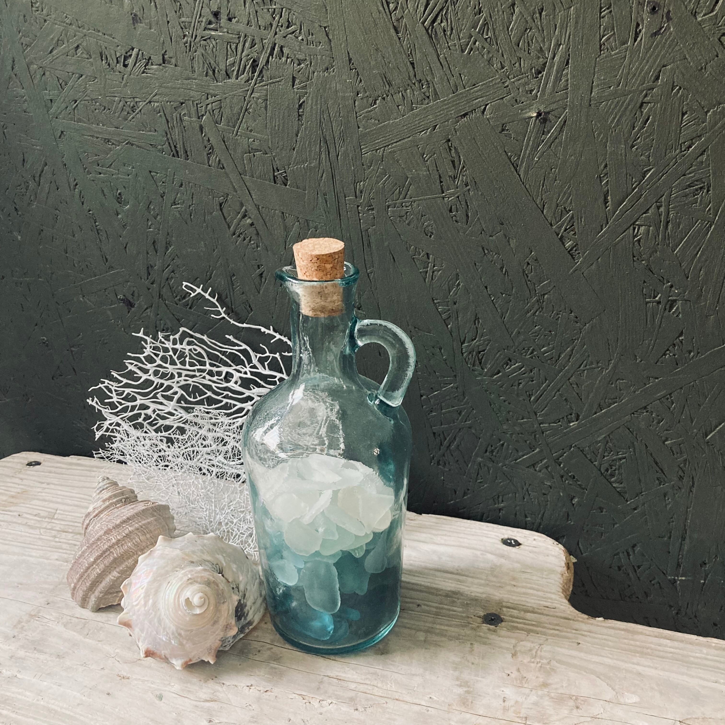 宮崎県のビーチにたどり着いたシーグラスを、コルクキャップのジャグボトルに、海そのものをイメージさせるブルー〜ホワイトのグラデーションになるようたっぷりと詰め込みました。