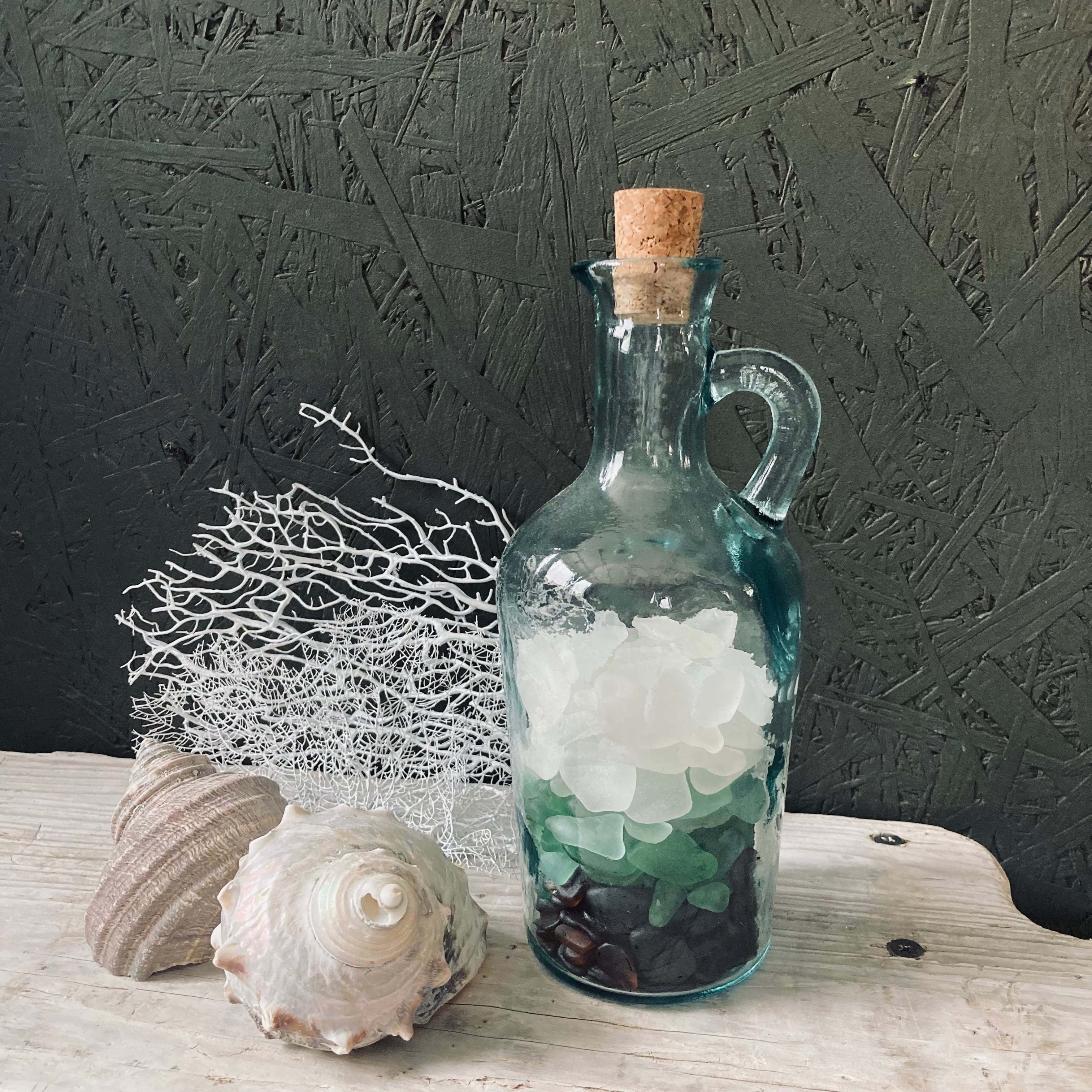 宮崎県のビーチにたどり着いたシーグラスを、コルクキャップのジャグボトルに、深海をイメージさせるブラウン〜グリーン〜ホワイトのグラデーションになるようたっぷりと詰め込みました。