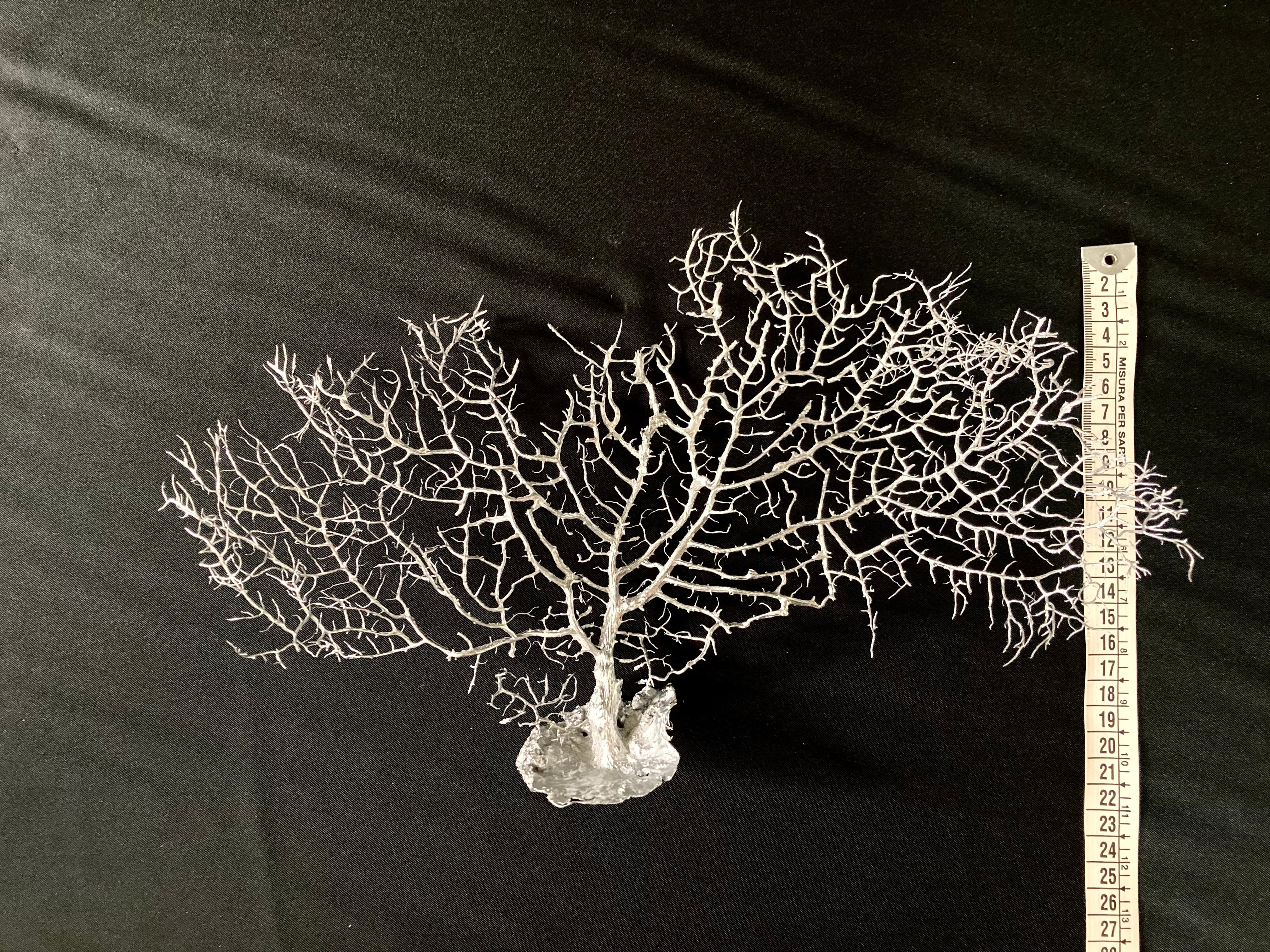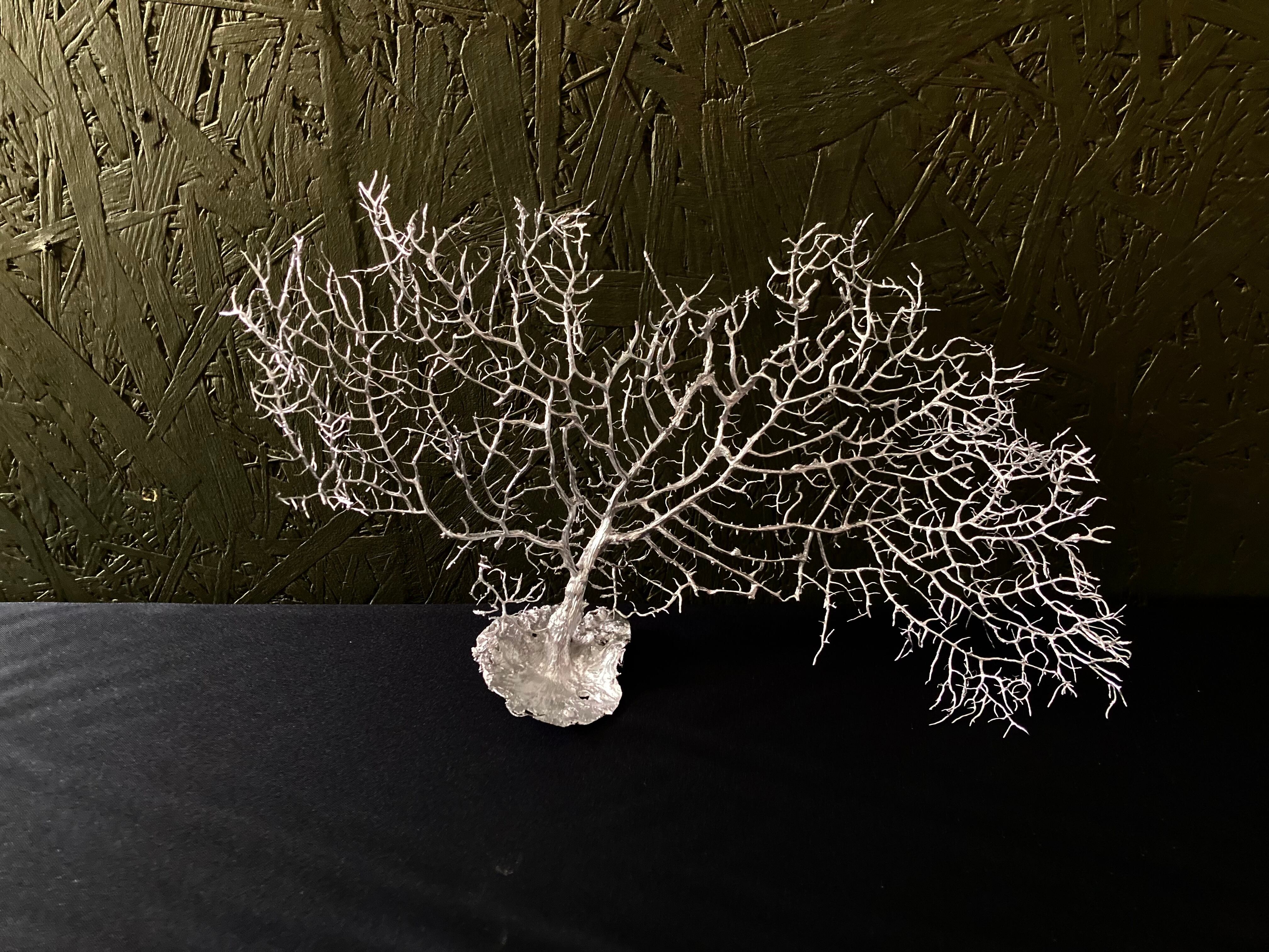魚網に絡まっていたものを丁寧に取り外し、消毒〜天日干しで下処理後、シルバー塗装で仕上げました。