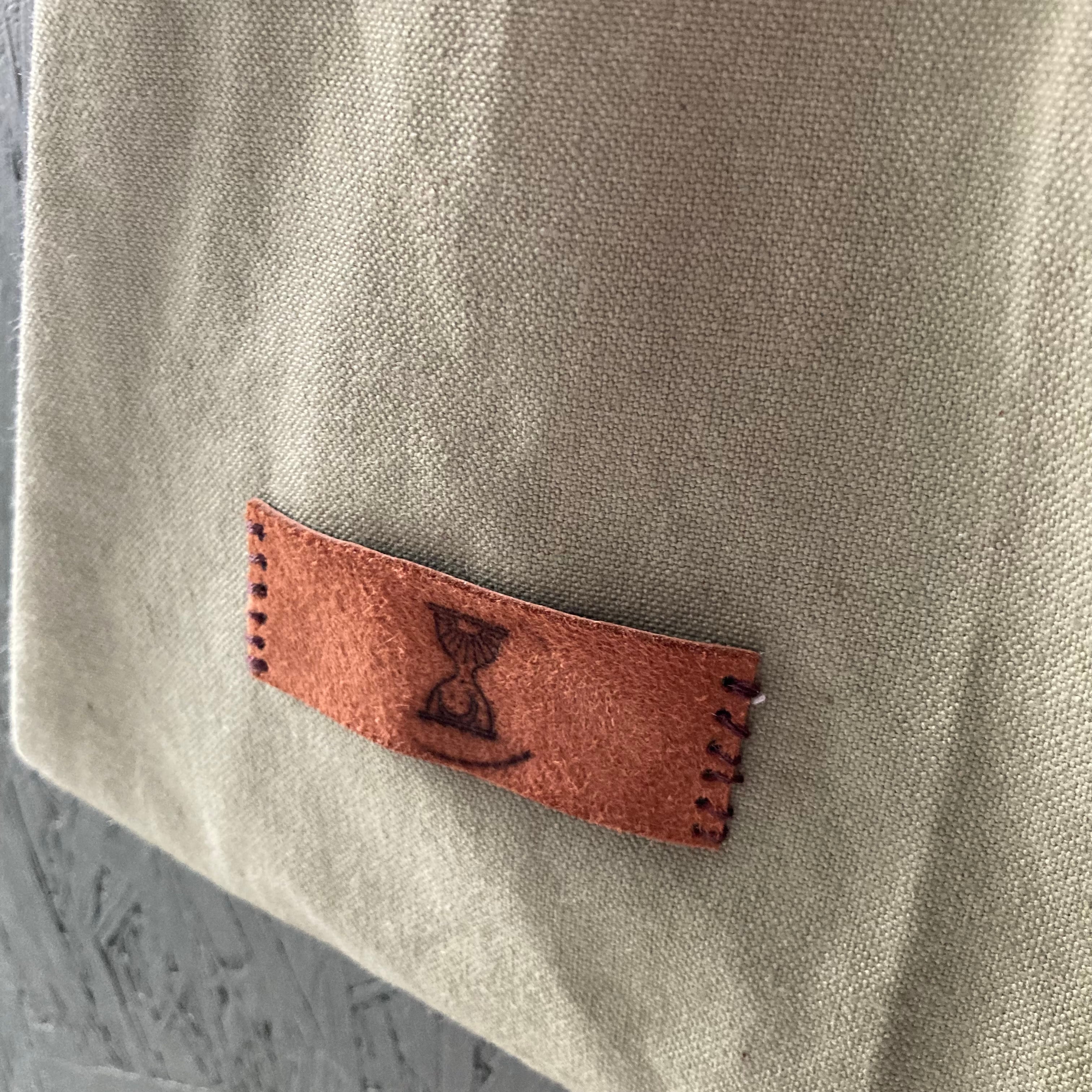 持ち手ベルトの付け根には、本革ハギレをおさえにし、全体的にアシンメトリーなデザインにしてみました。