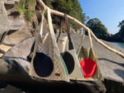 カーキの帆布に、赤いデニムの大きなサークルをポケットにしました。日焼け止めやタオルなどの小物入れられます。