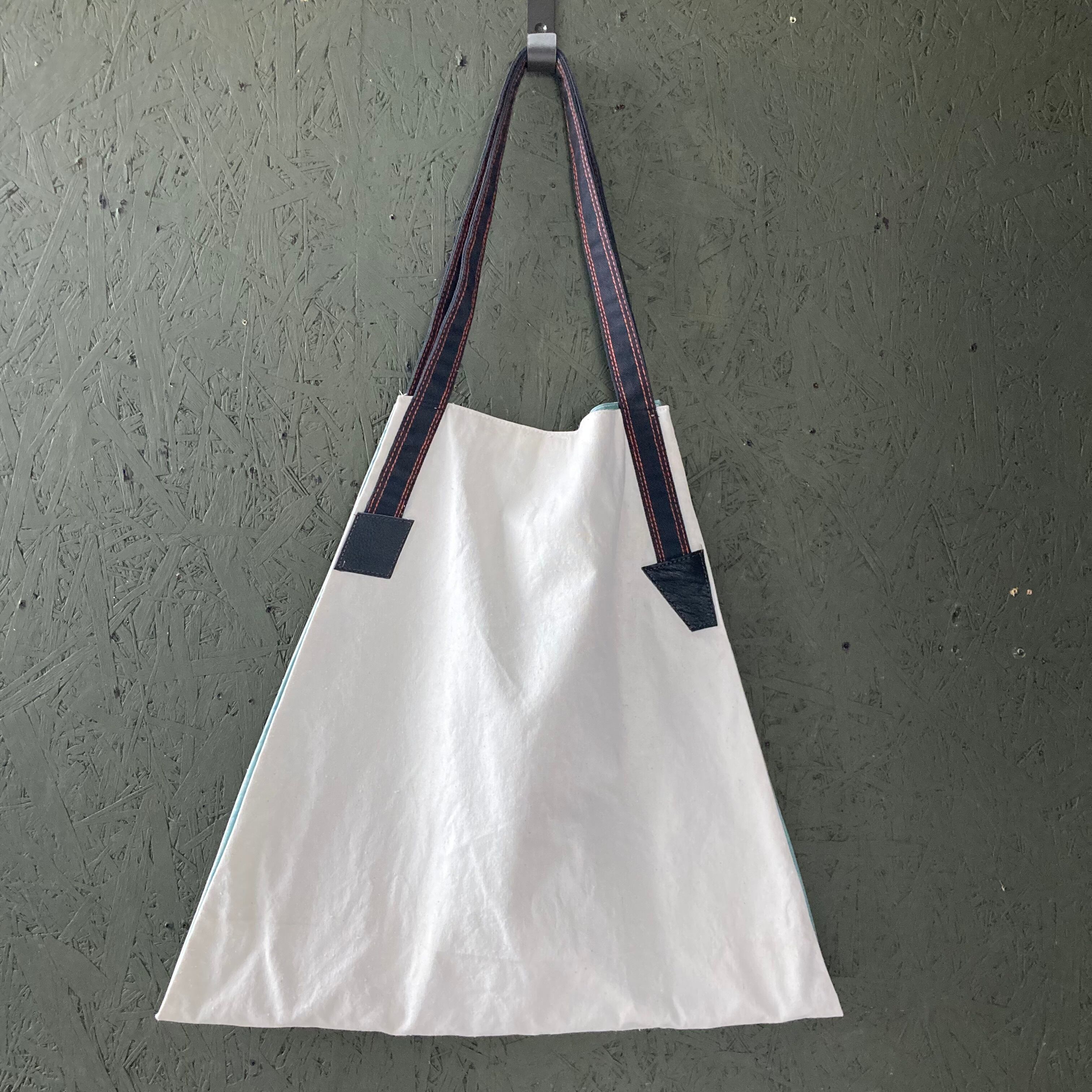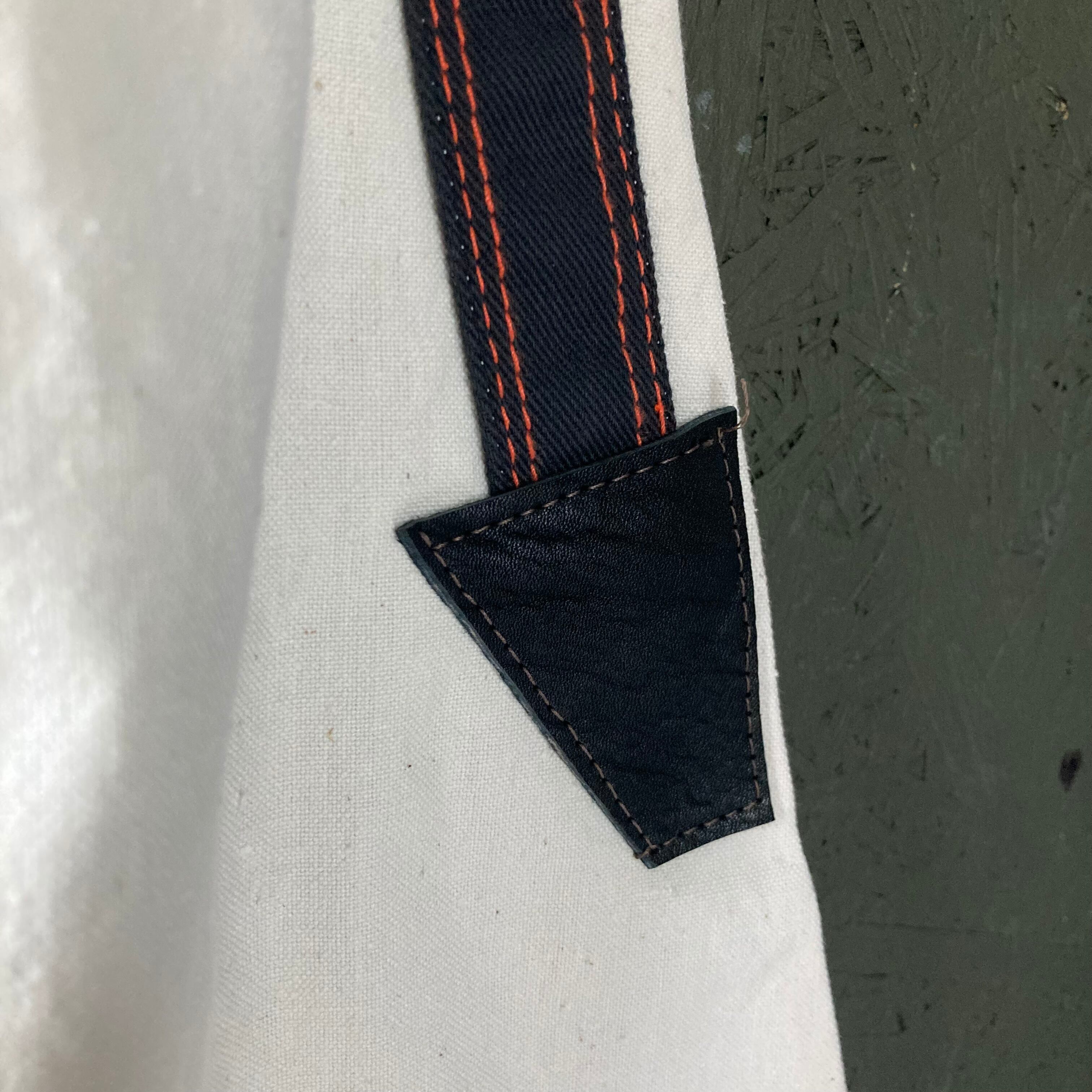 持ち手ベルトの付け根には、本革ハギレをおさえにし、全体的にアシンメトリーなデザインにしてみました。