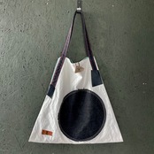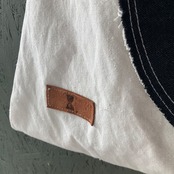 アイボリーの帆布に、ブラックデニムの大きなサークルをポケットにしました。日焼け止めやタオルなどの小物入れられます。