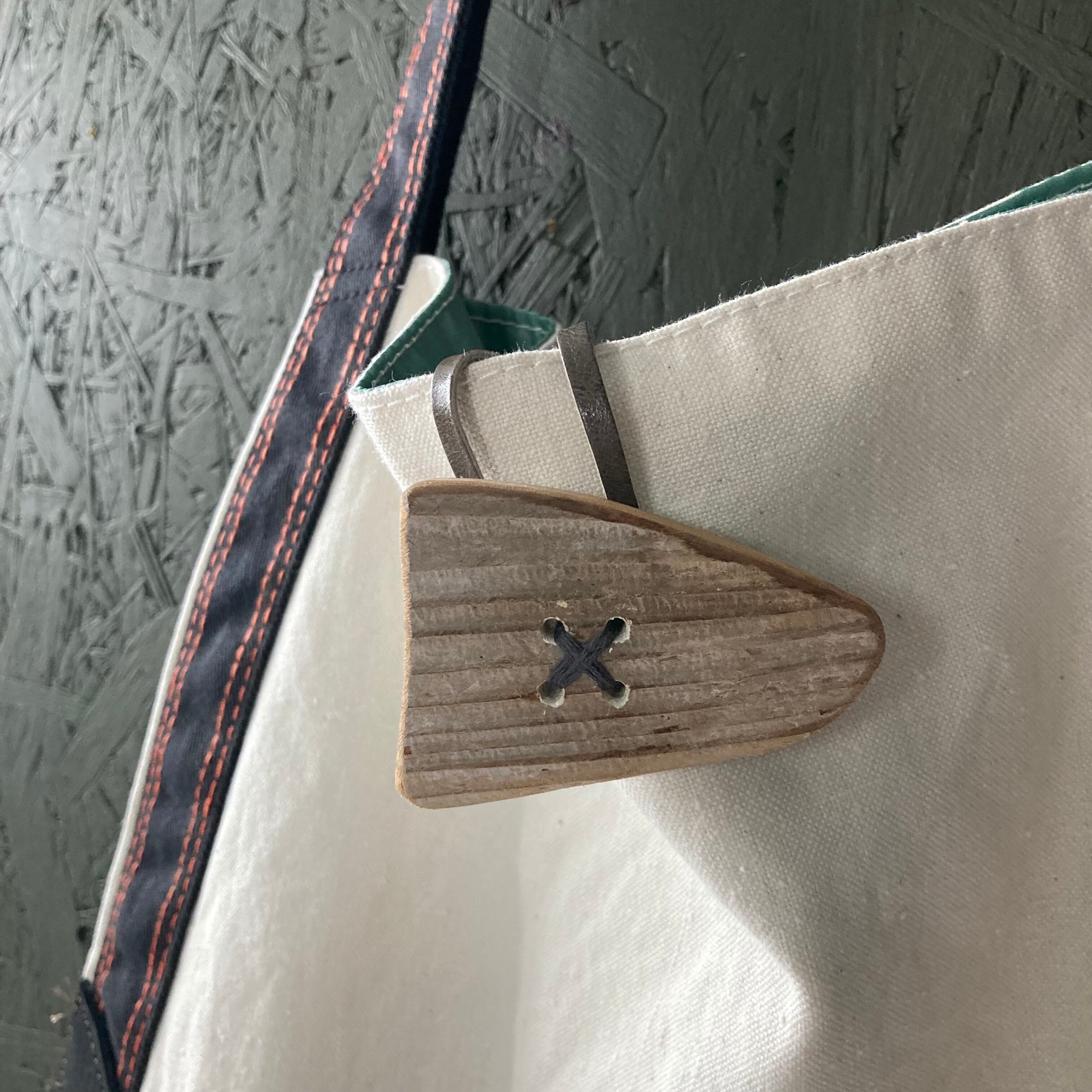 開閉部には、流木で作ったボタンをあしらいました。(宮崎のビーチで収集した流木です)