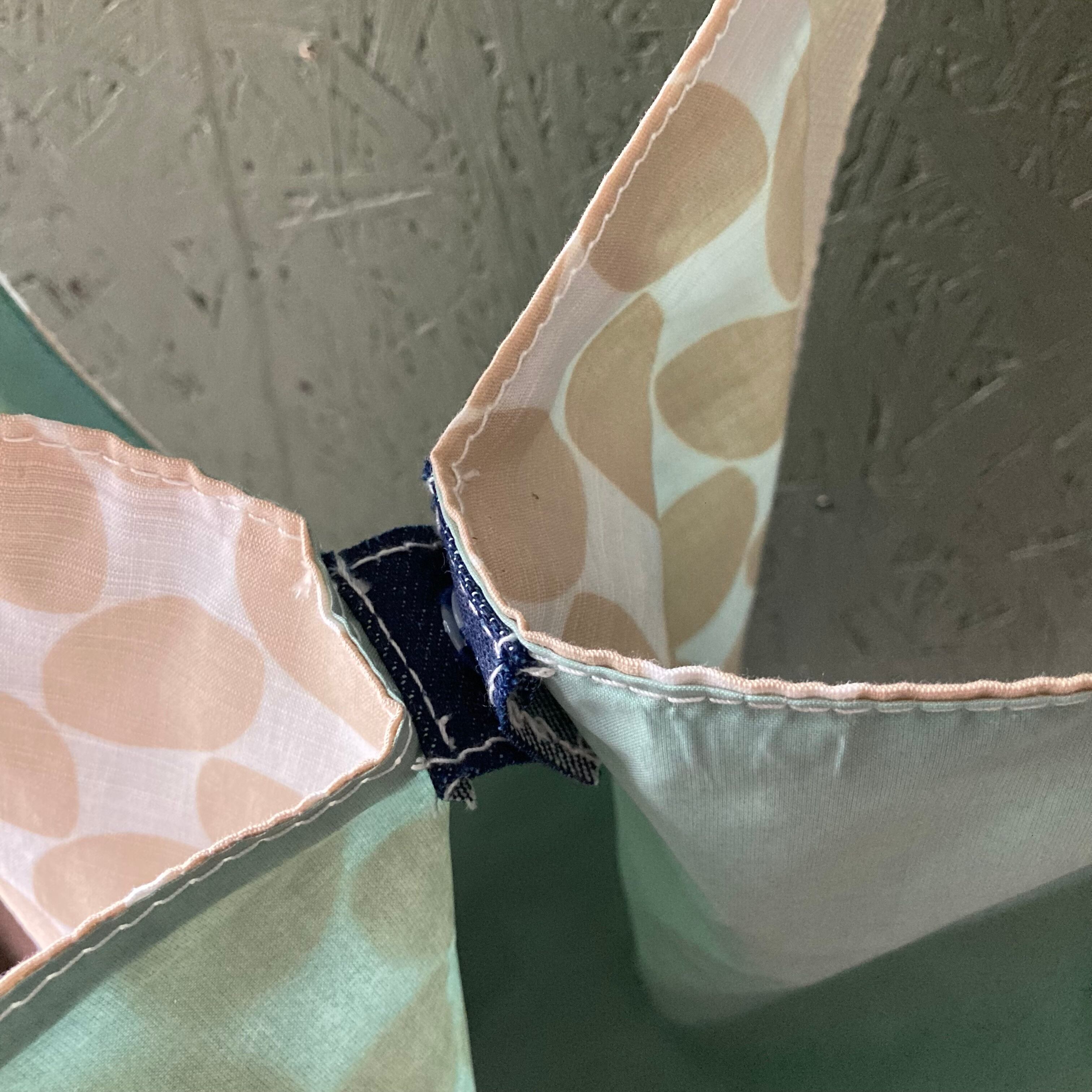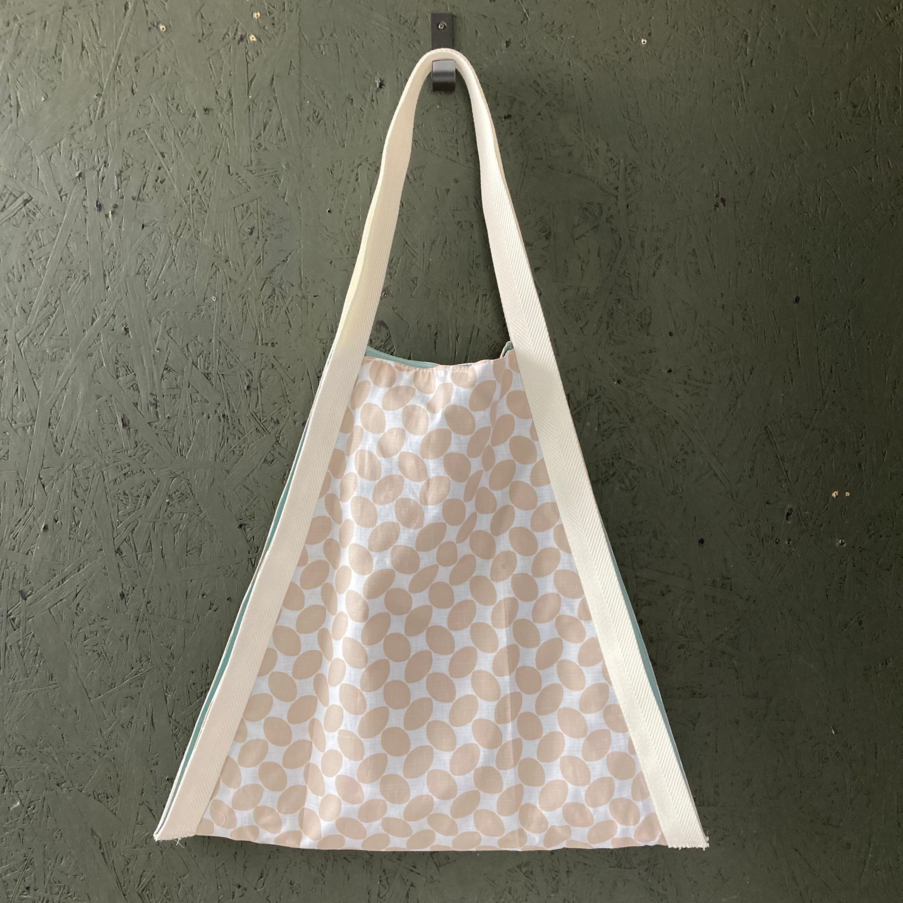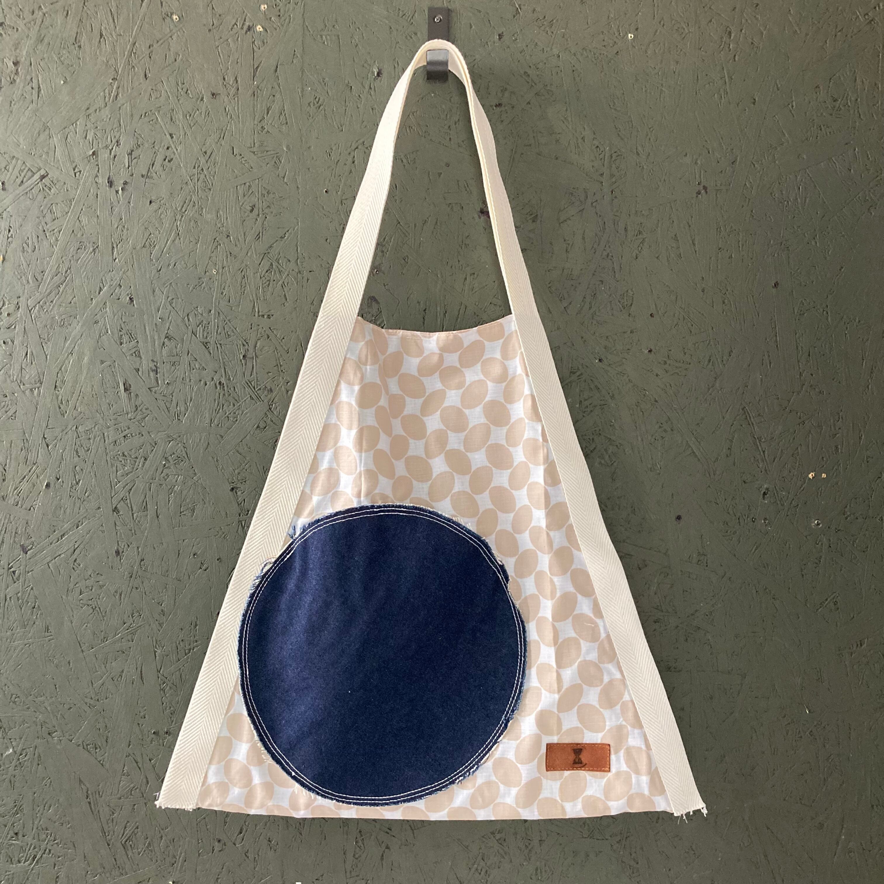 ベージュに白のドット柄に、デニムの大きなサークルをポケットにしました。日焼け止めやタオルなどの小物入れられます。