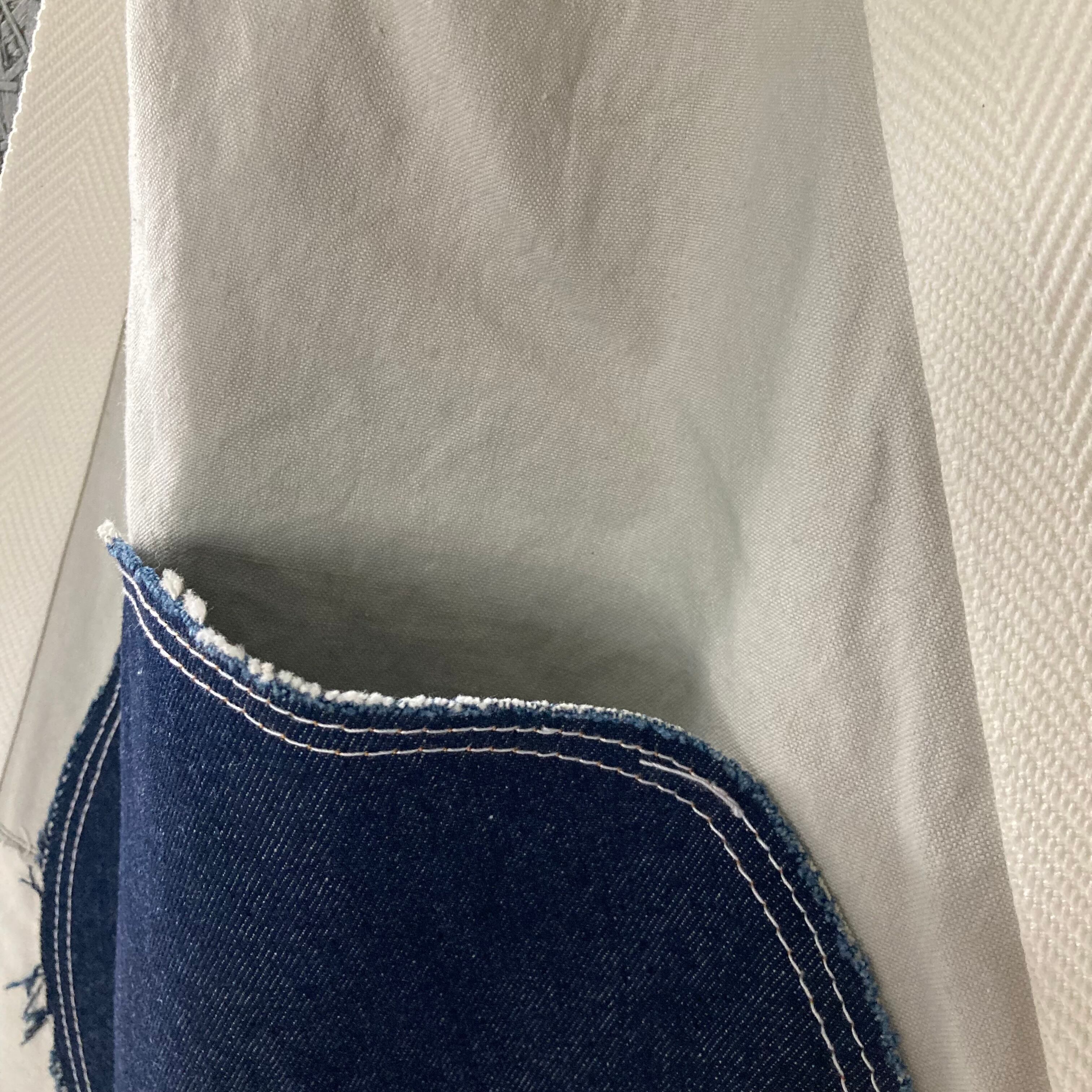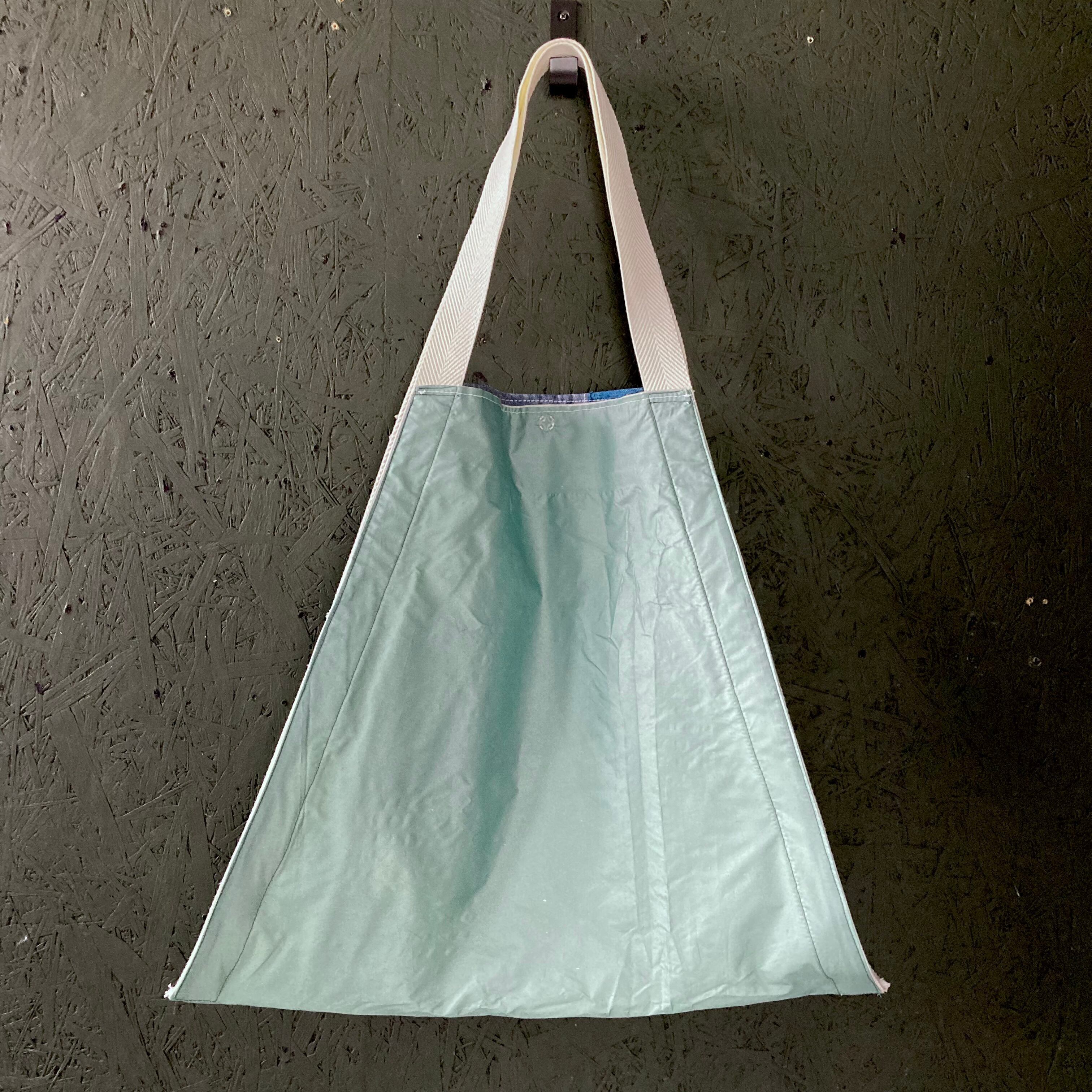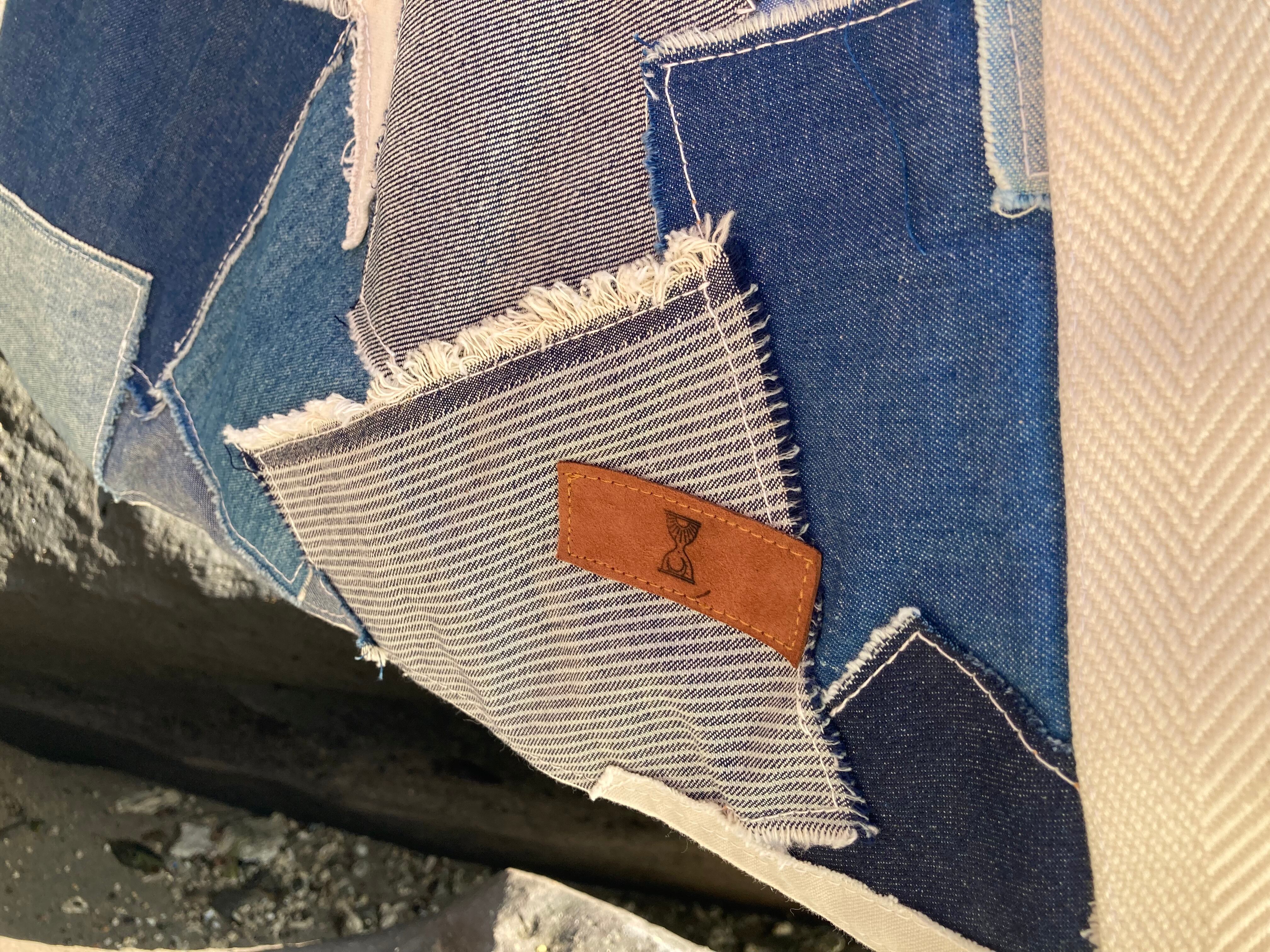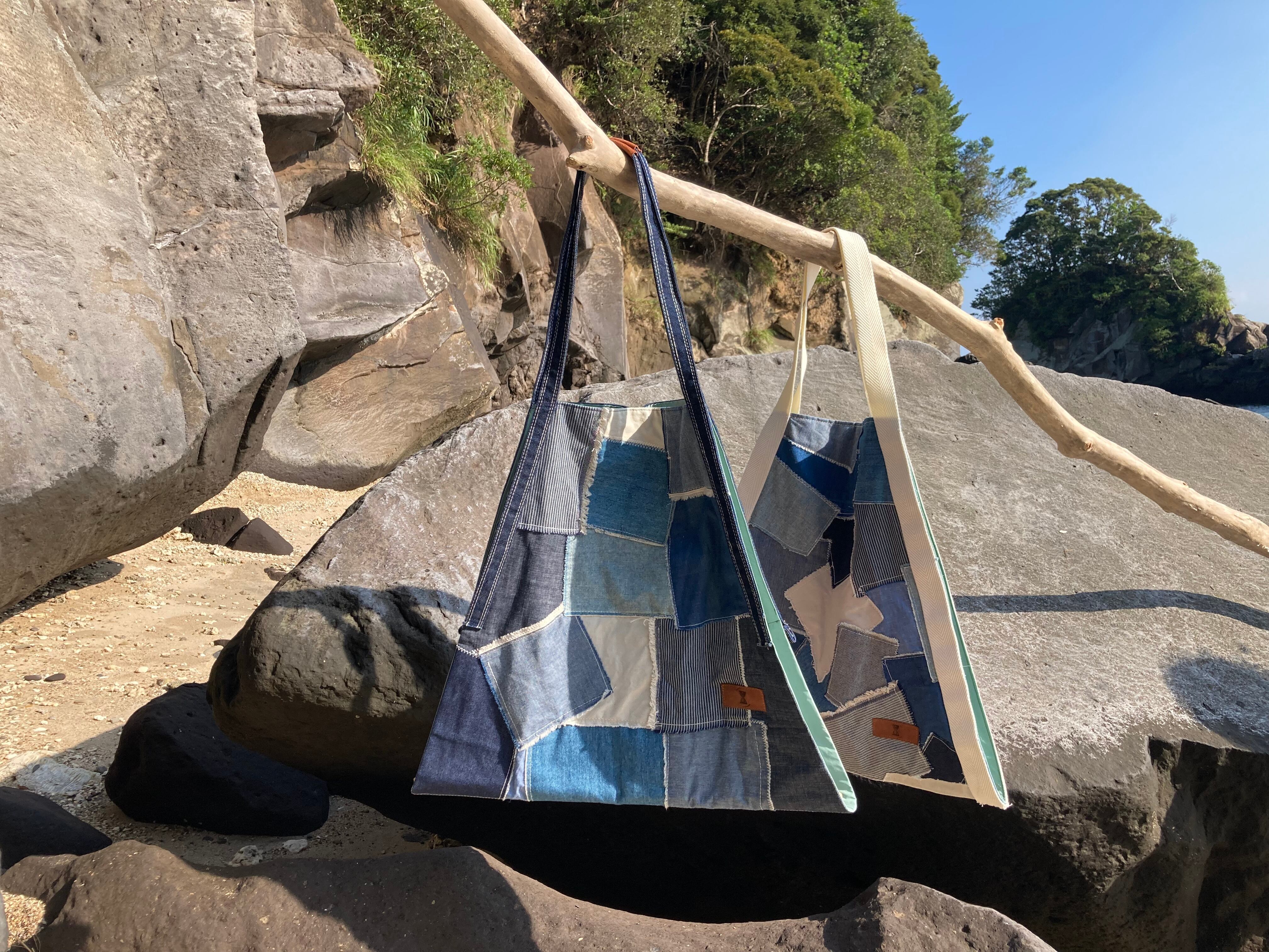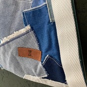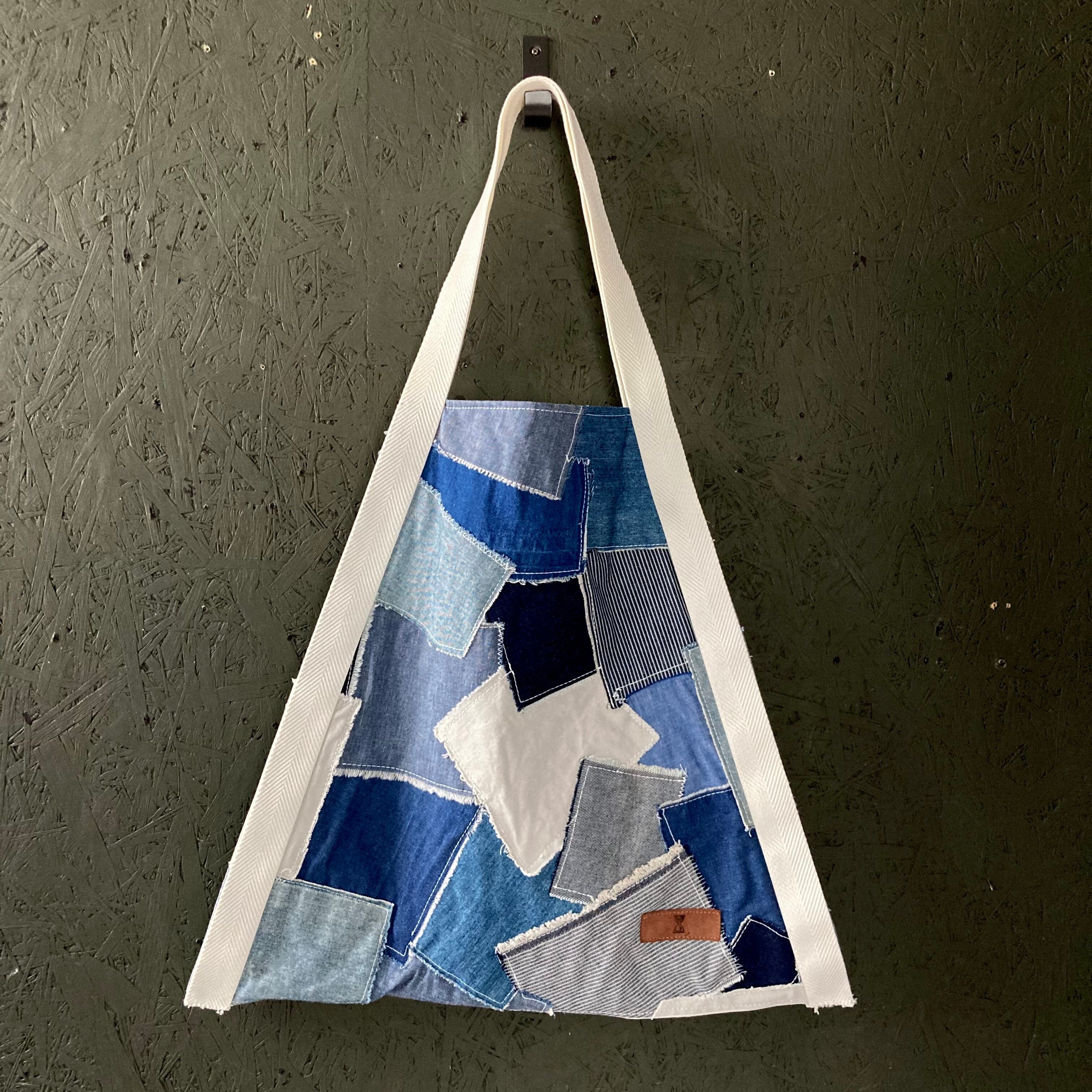デニムのハギレをパッチワーク。裏面はアイボリーの帆布に大きなサークルのデニムをポケットにしました。