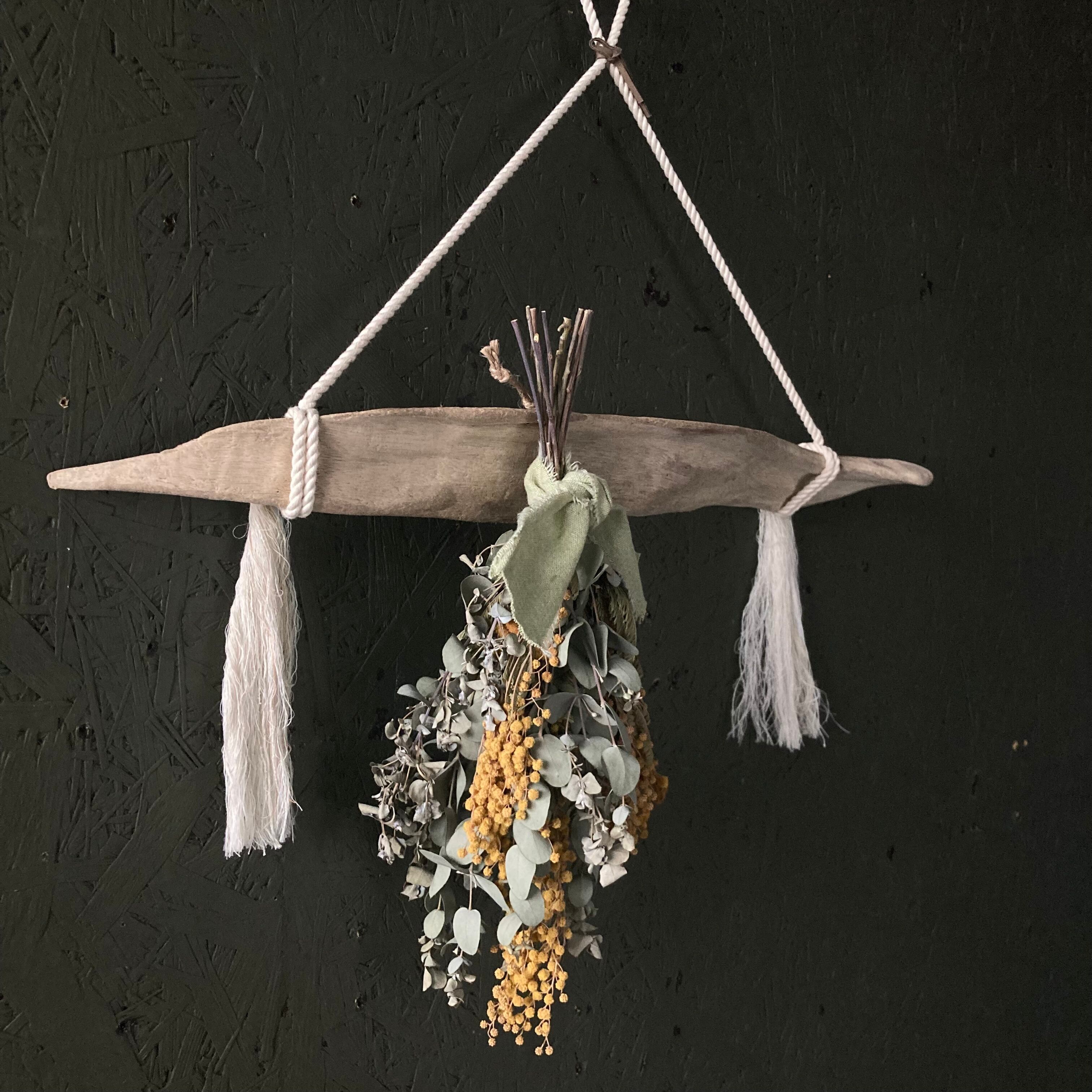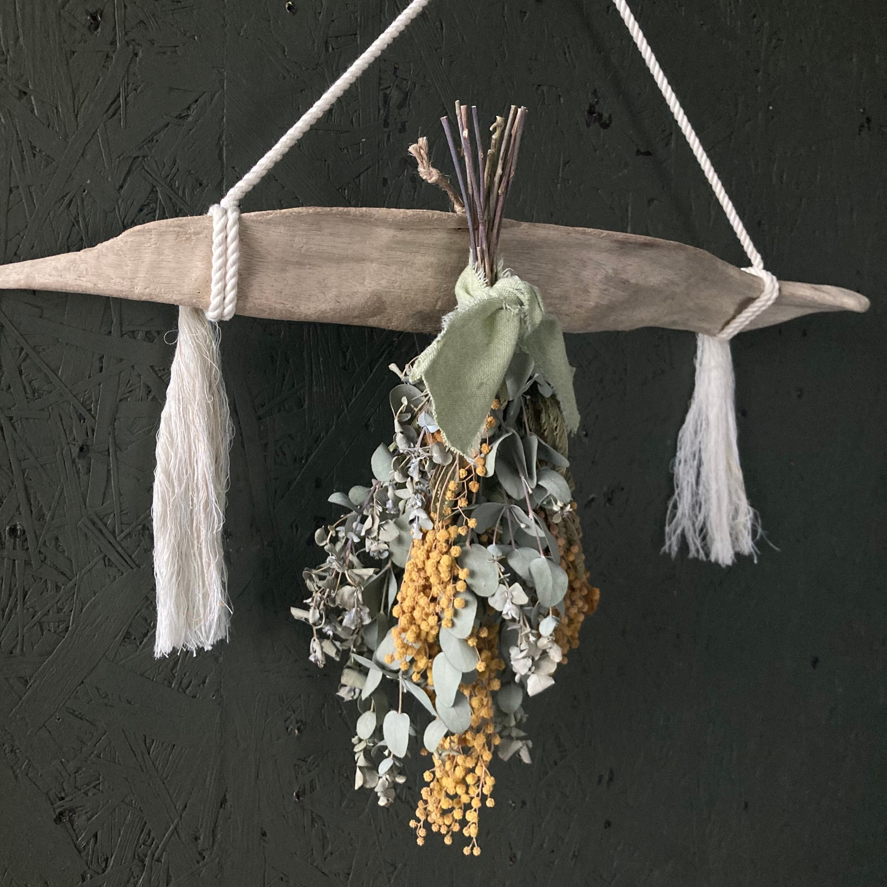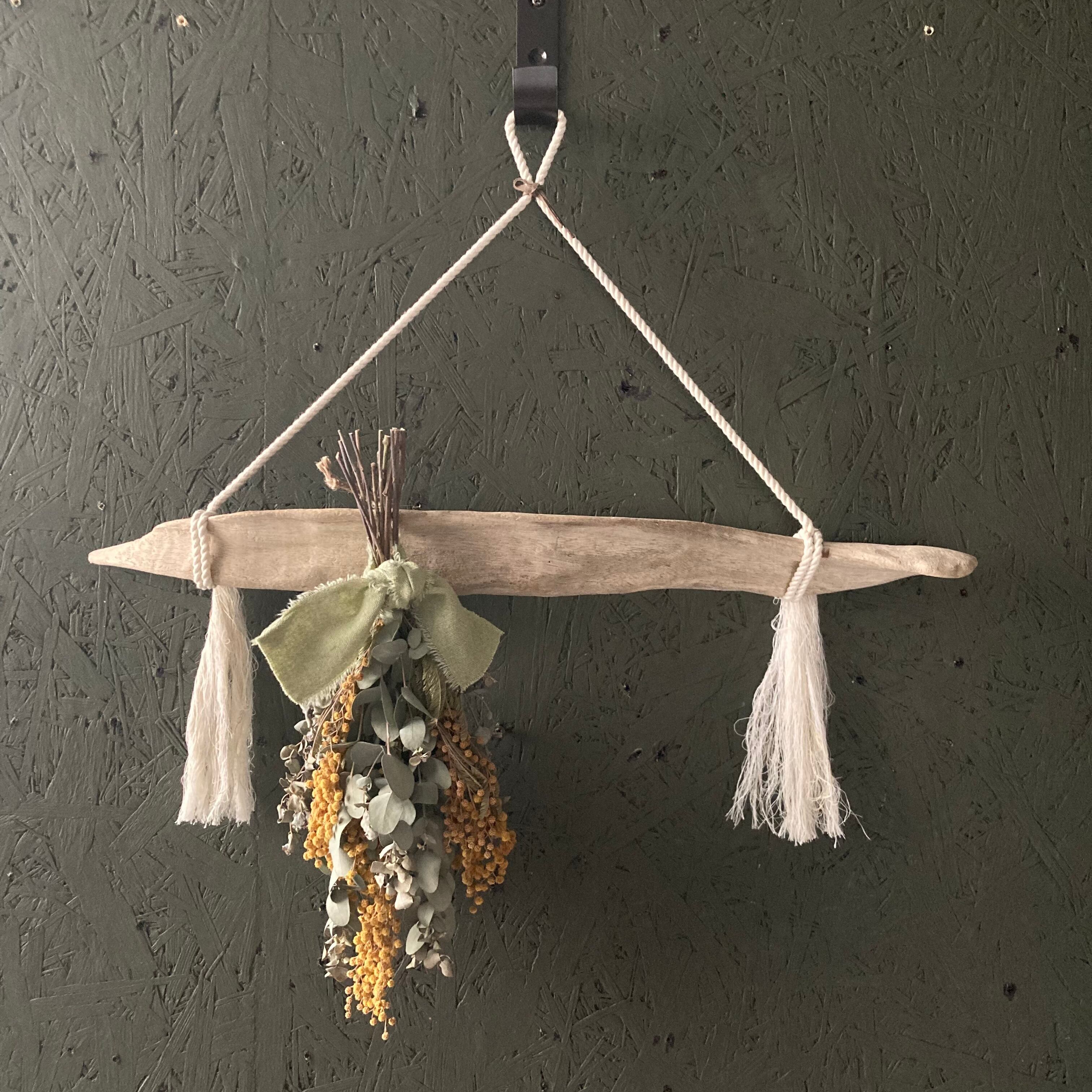 鮮やかなイエローのミモザのドライフラワーを流木のハンガーに合わせました。