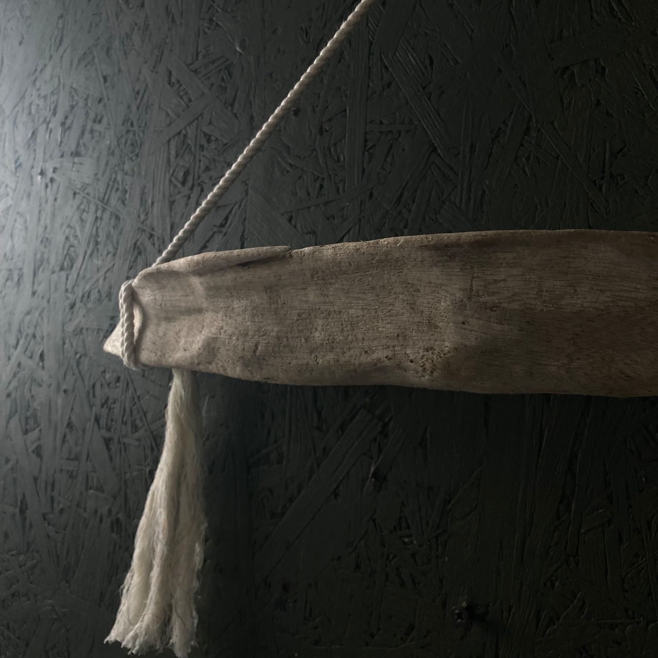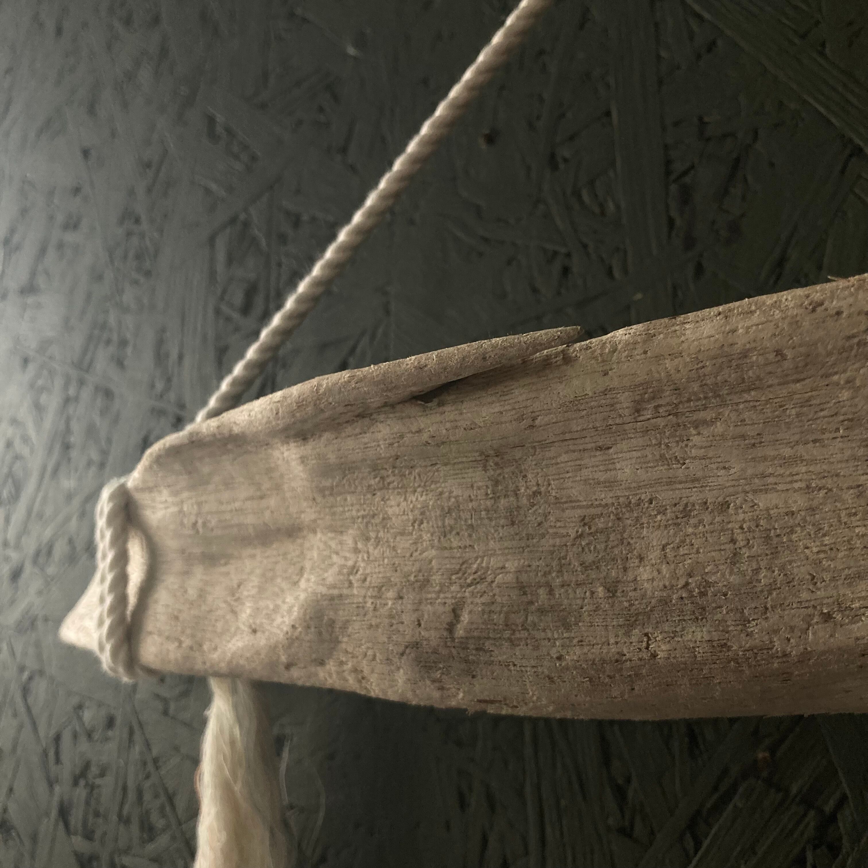 流木の割れ目にドライフラワーの麻紐を引っ掛けて取り付けます。
